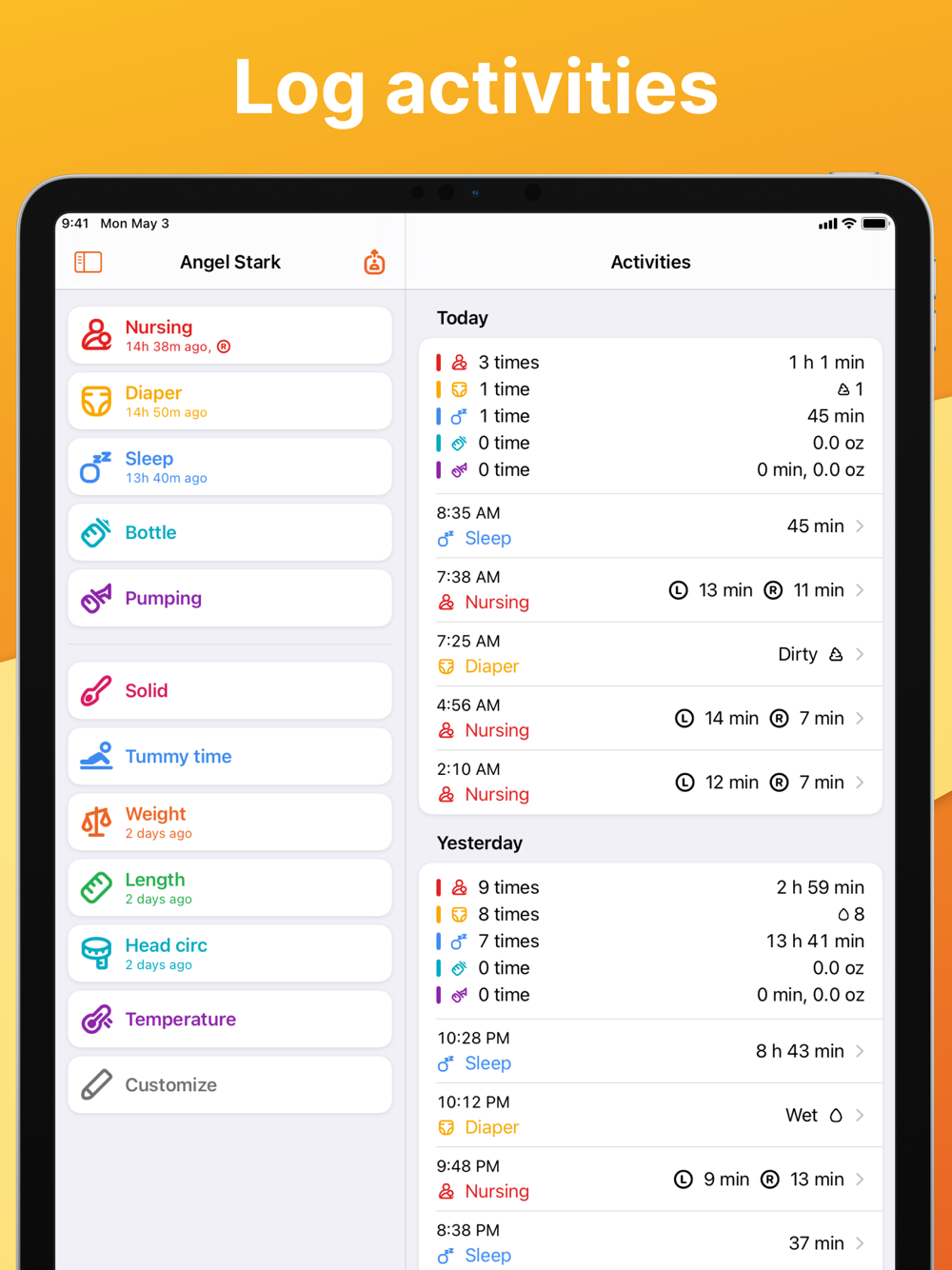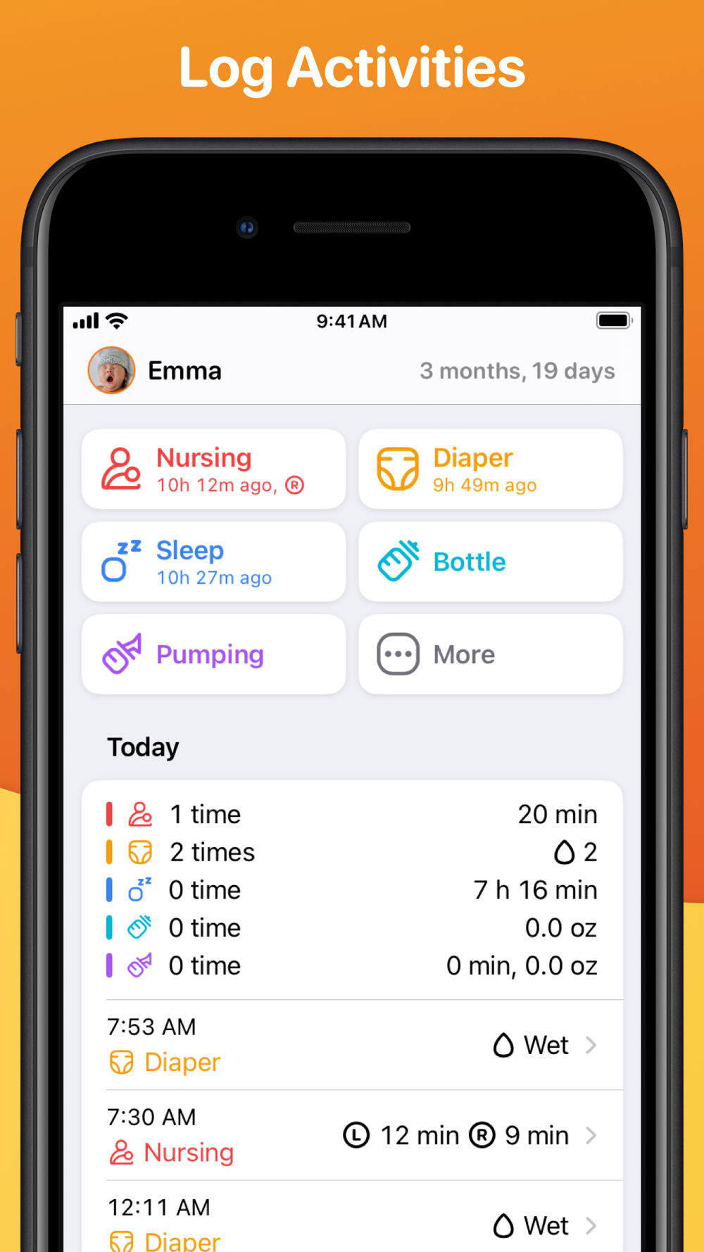 + Track baby activities: Log a variety of baby activities such as nursing, diaper, sleeping, bottle, pumping, and solid.