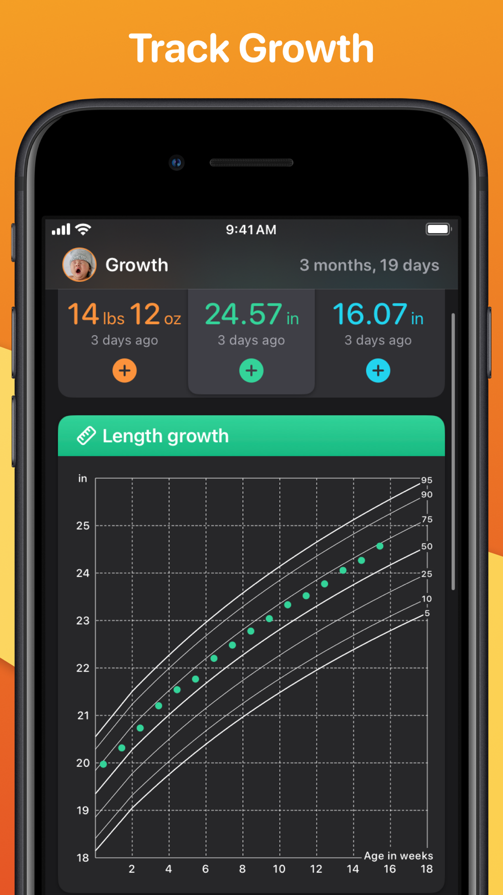 + Monitor baby growth: Log baby’s weight, length, and head circumference, and view their growth percentile over time.
