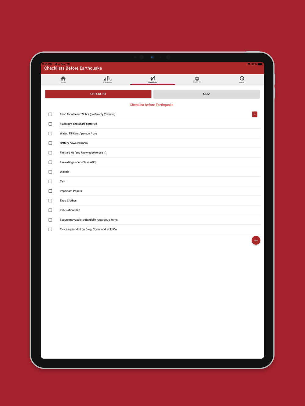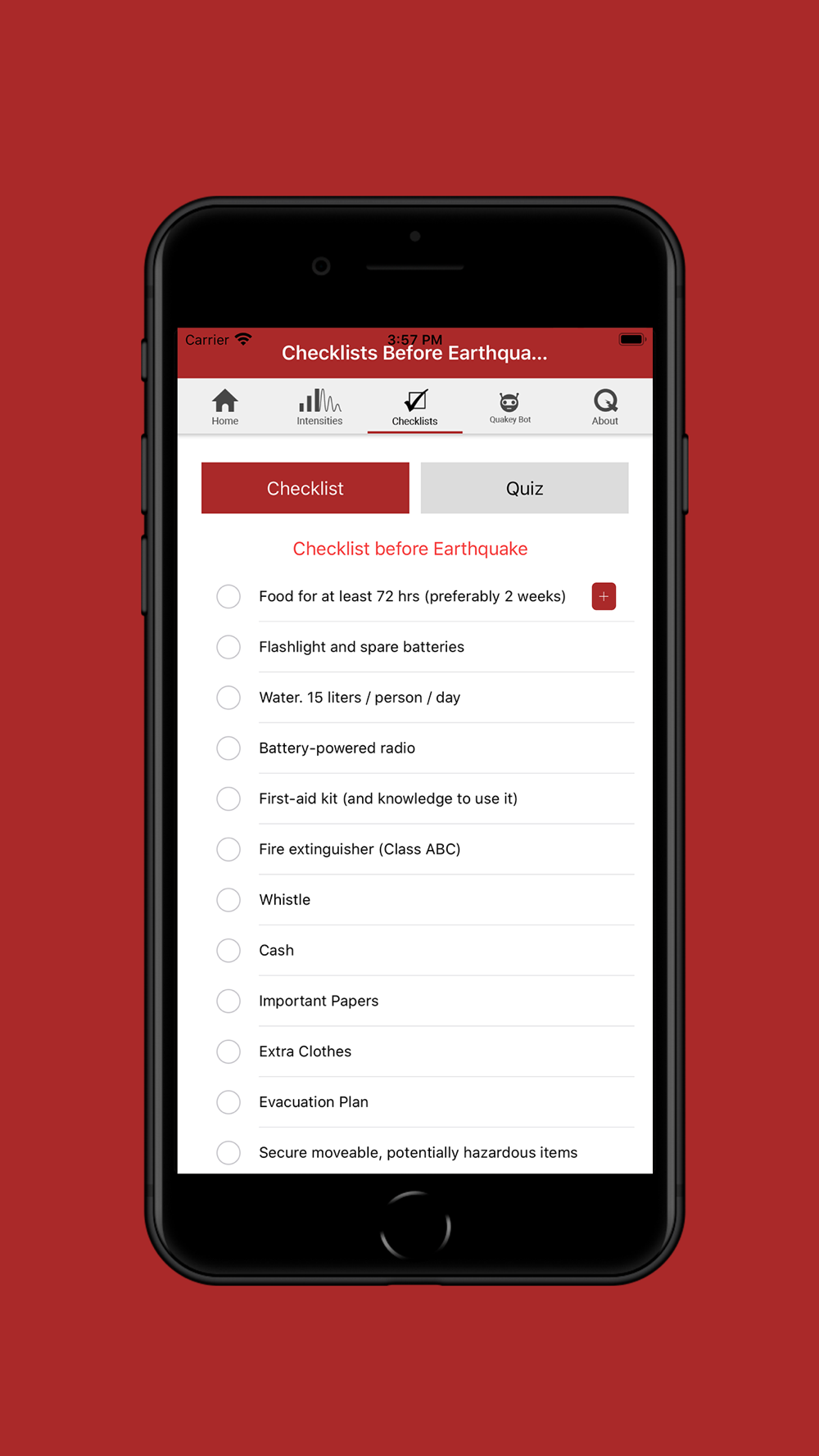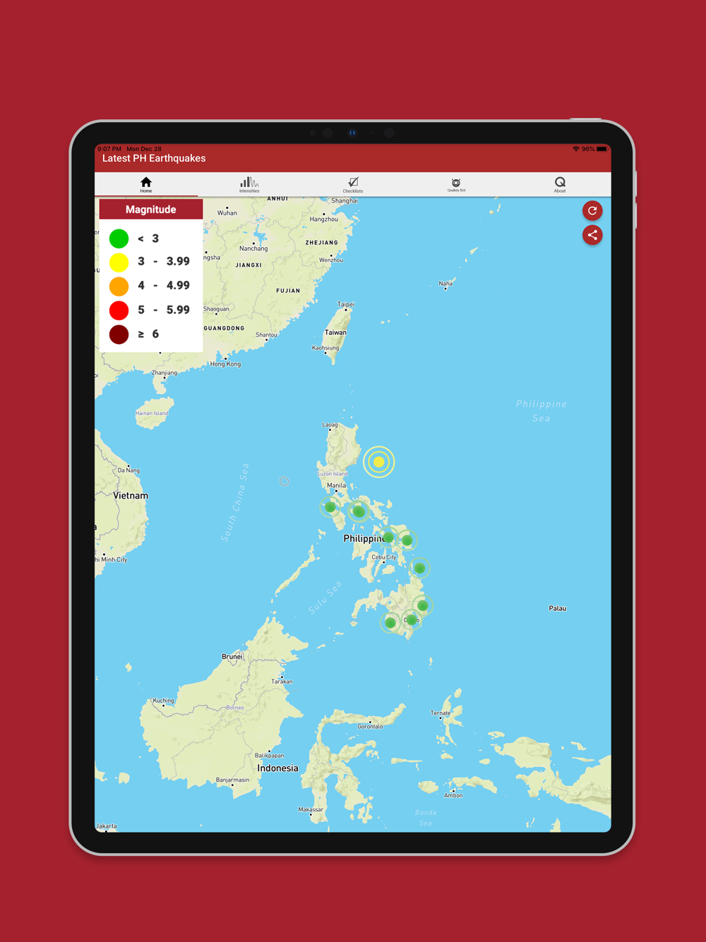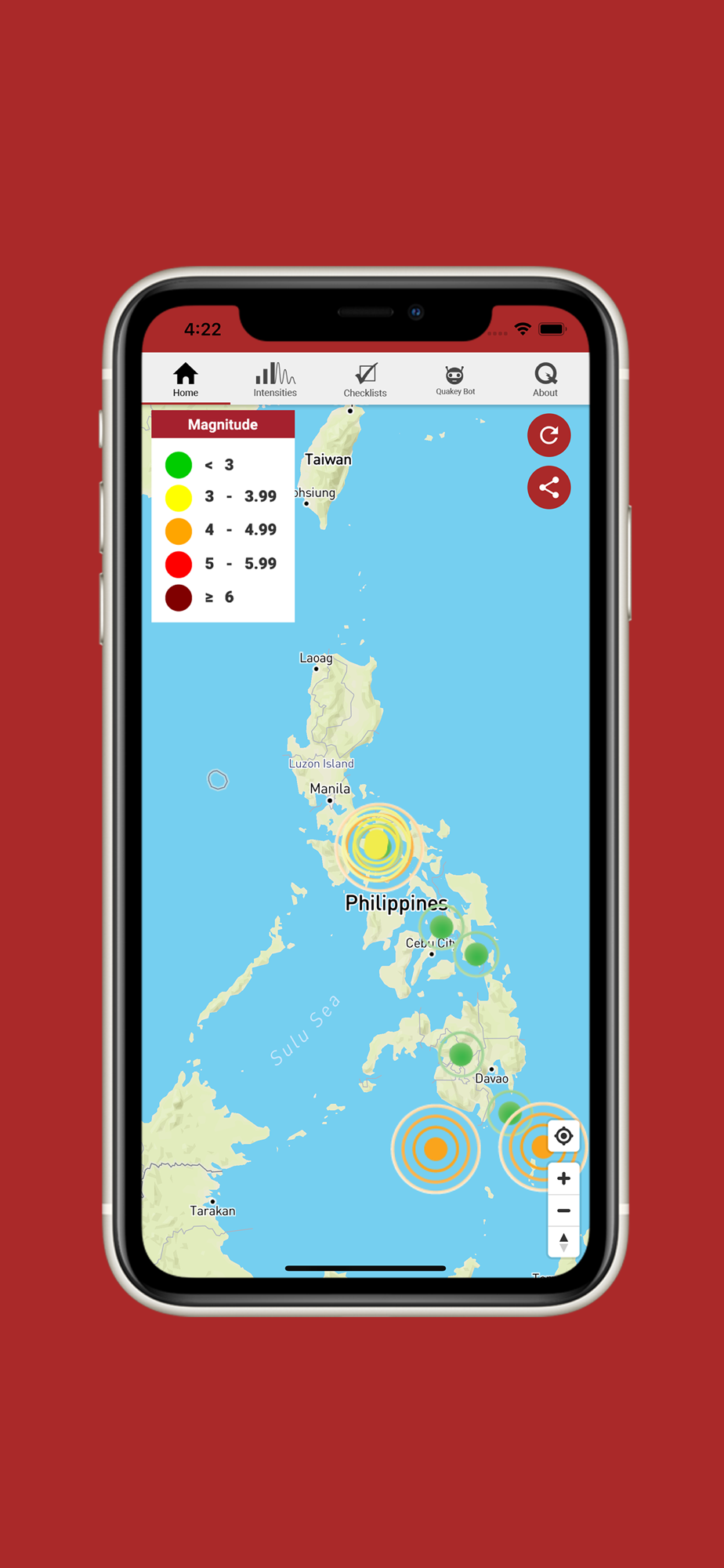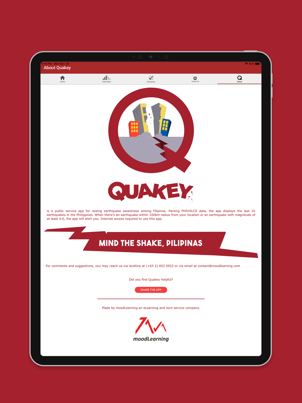 Quakey monitors earthquakes in the Philippines by parsing PHILVOCS and USGS data and visualizing them. An earthquake within your 300 km radius or one with a magnitude greater than 4 triggers an alert. Quakey also enables you to share your exact location with friends, family, and contacts. Internet access is required to use this app.