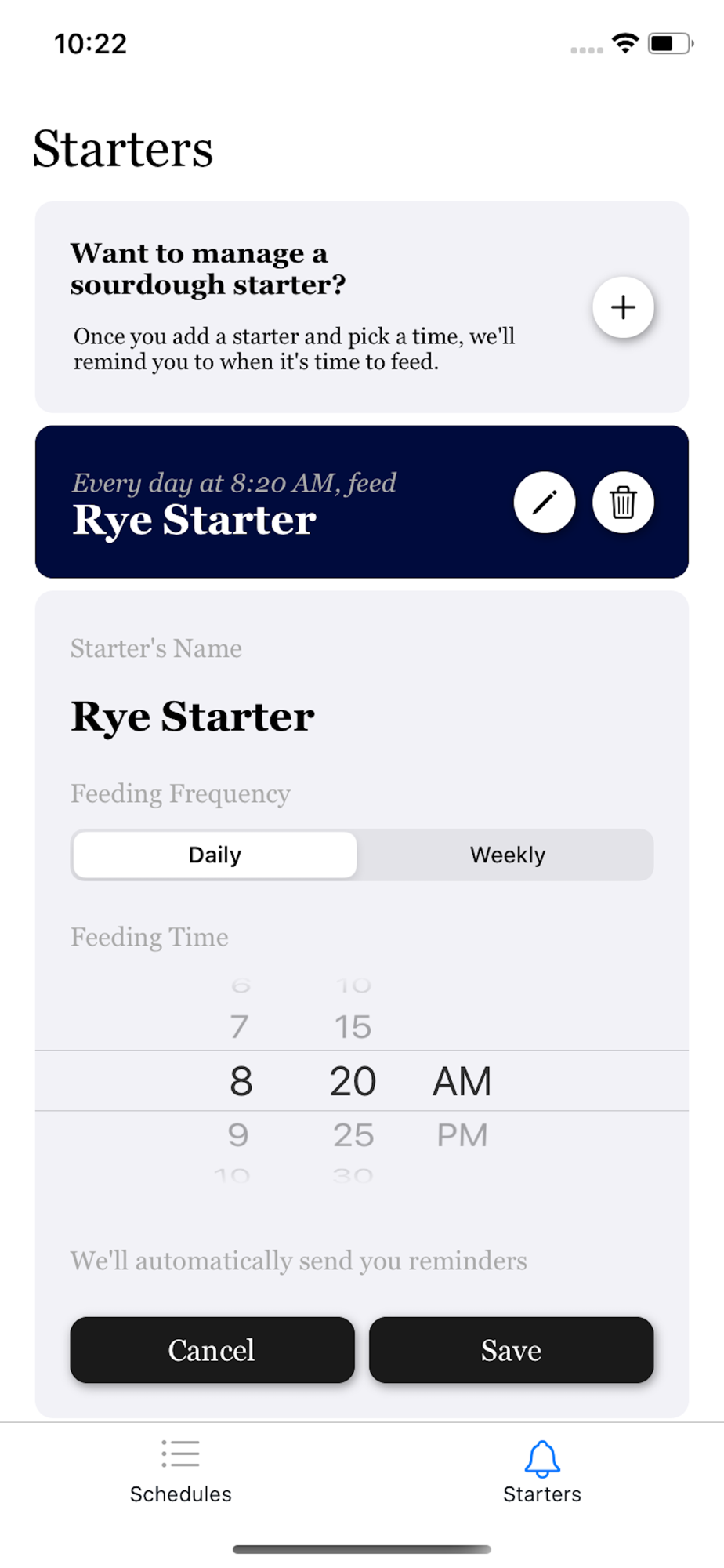 Often when I 'd bake bread on the weekends, I'd get tired of setting so many timers. So, I built this app that allowed me to enter my custom baking schedule and it would send me reminder notifications whenever it was time to start the next step. Plus, it helps remind bakers that they need to feed their starter - whether you feed daily or weekly.