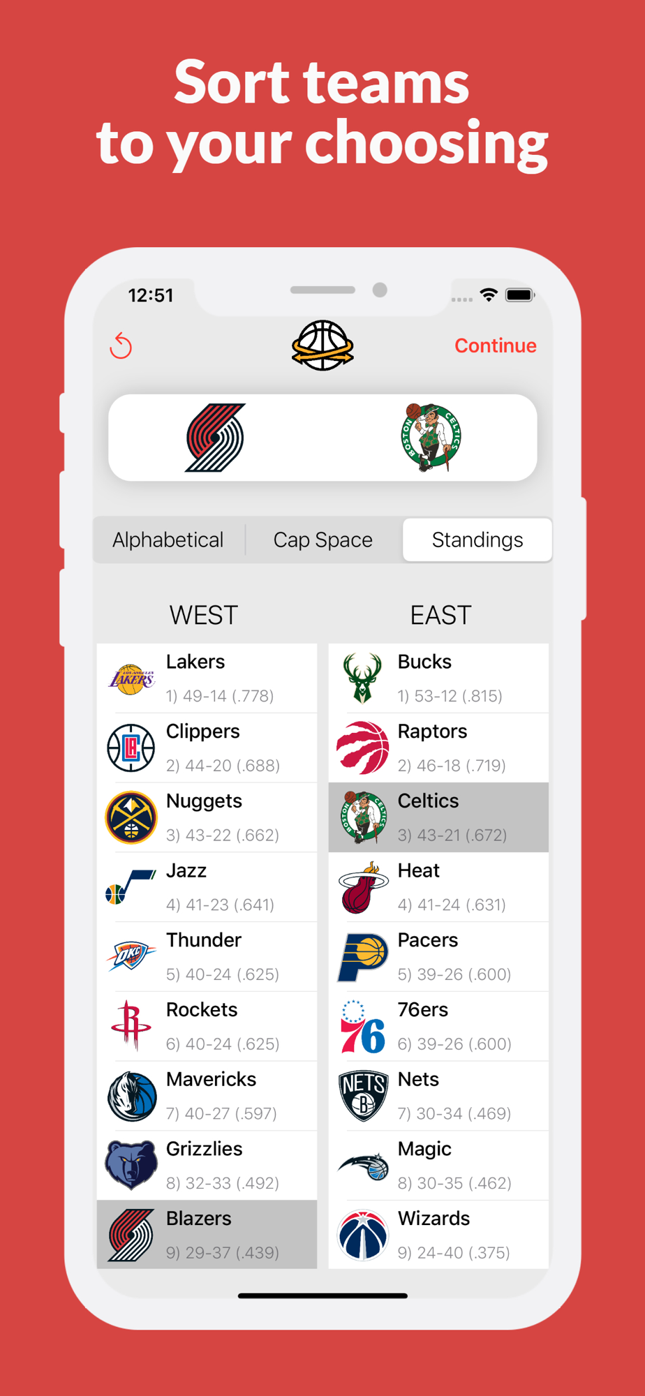 - Sort teams by cap space or current winning record