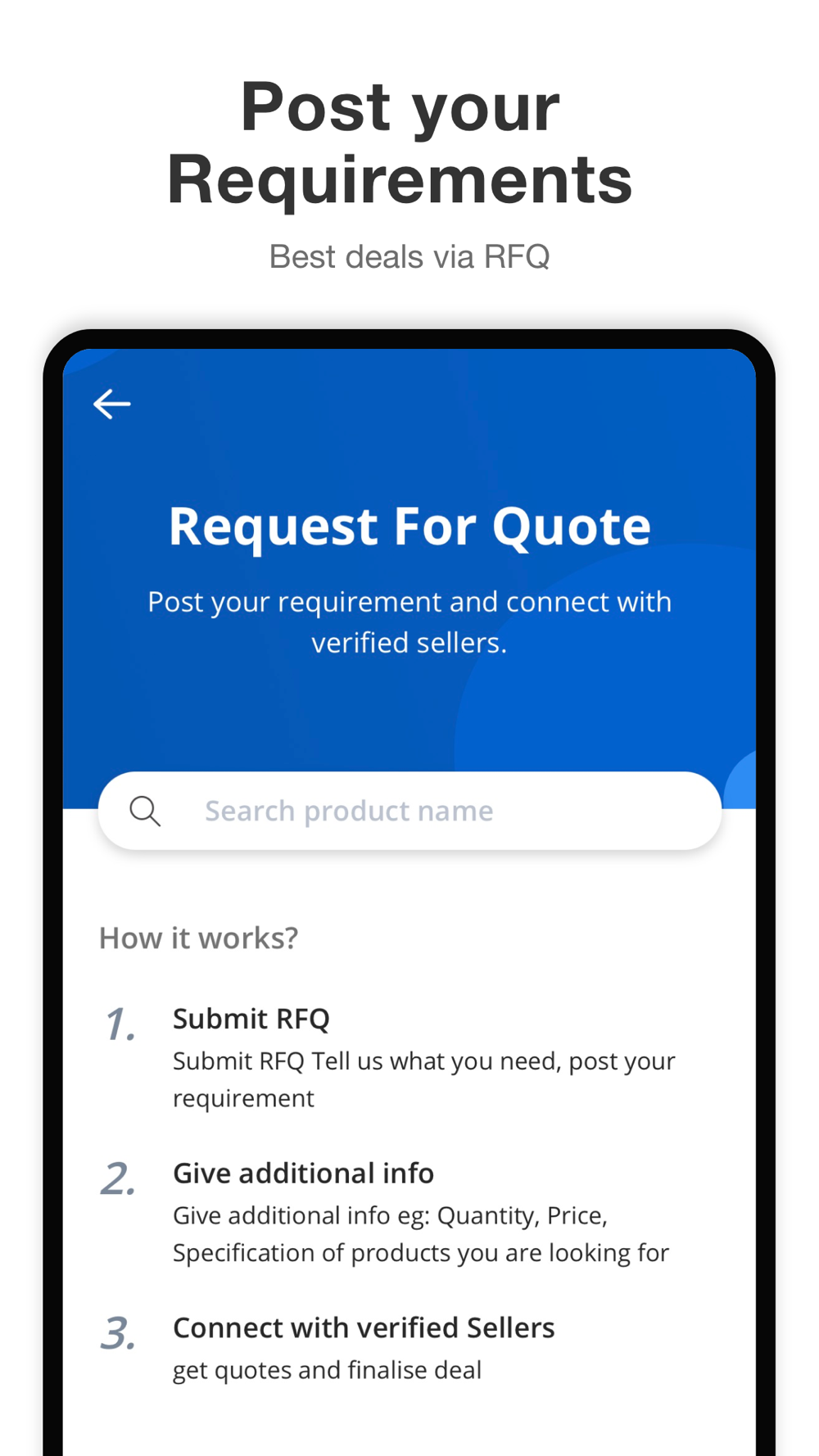 The app has a unique RFQ feature which stands for request for quote. This feature enables users to share product requests, whether a single unit or bulk quantity, directly via the app. Users can get in touch with various vendors and get the best deals for their requirements from them.