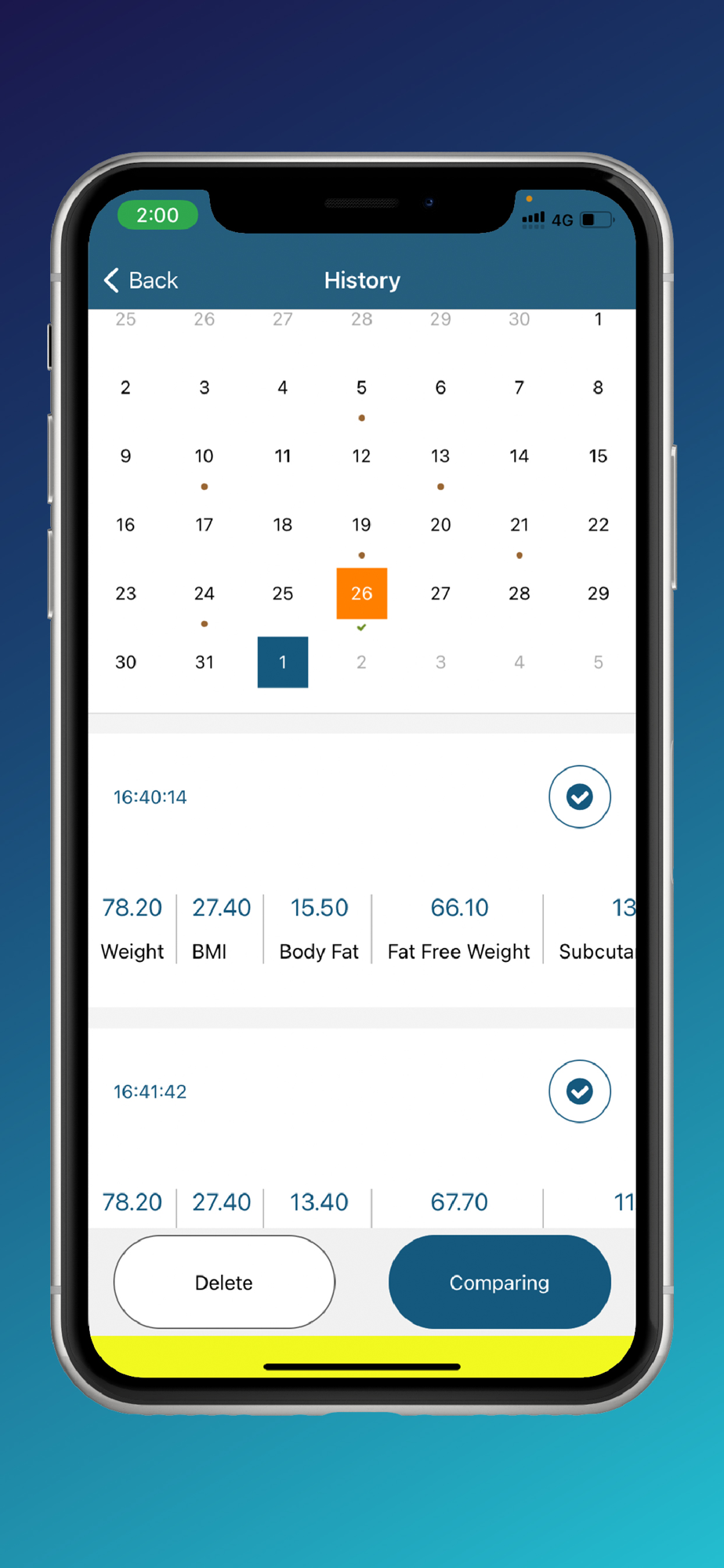 Compare Readings - Compare your body composition data between the most recent reading or between any two dates of your choice.