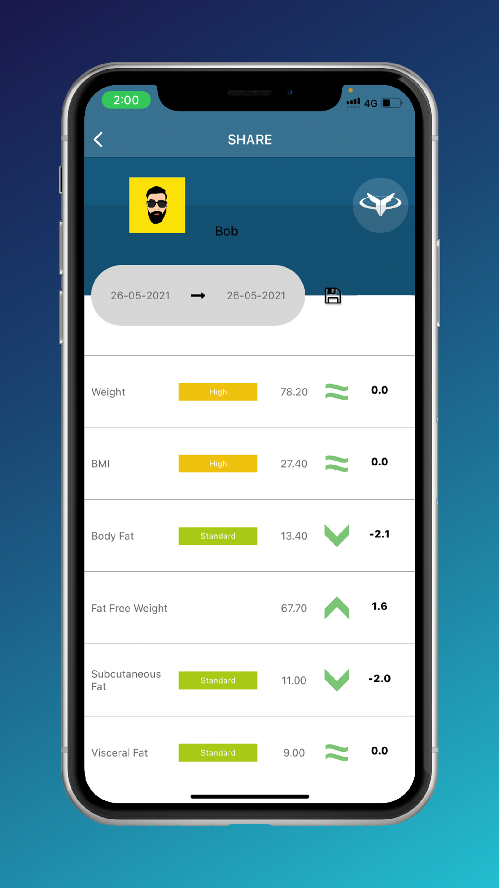 Auto Zoning of Values: The smartscale readings are auto-filtered into health zones based on the universal zoning mechanisms and the users profile, giving an instant outlook on the users health index.