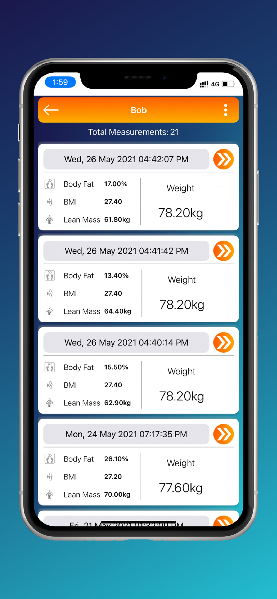Muscle size measurements - Use the App to input sizes for your calves, abdomen, biceps, arms etc to allow you to measure changes in your body over a single platform