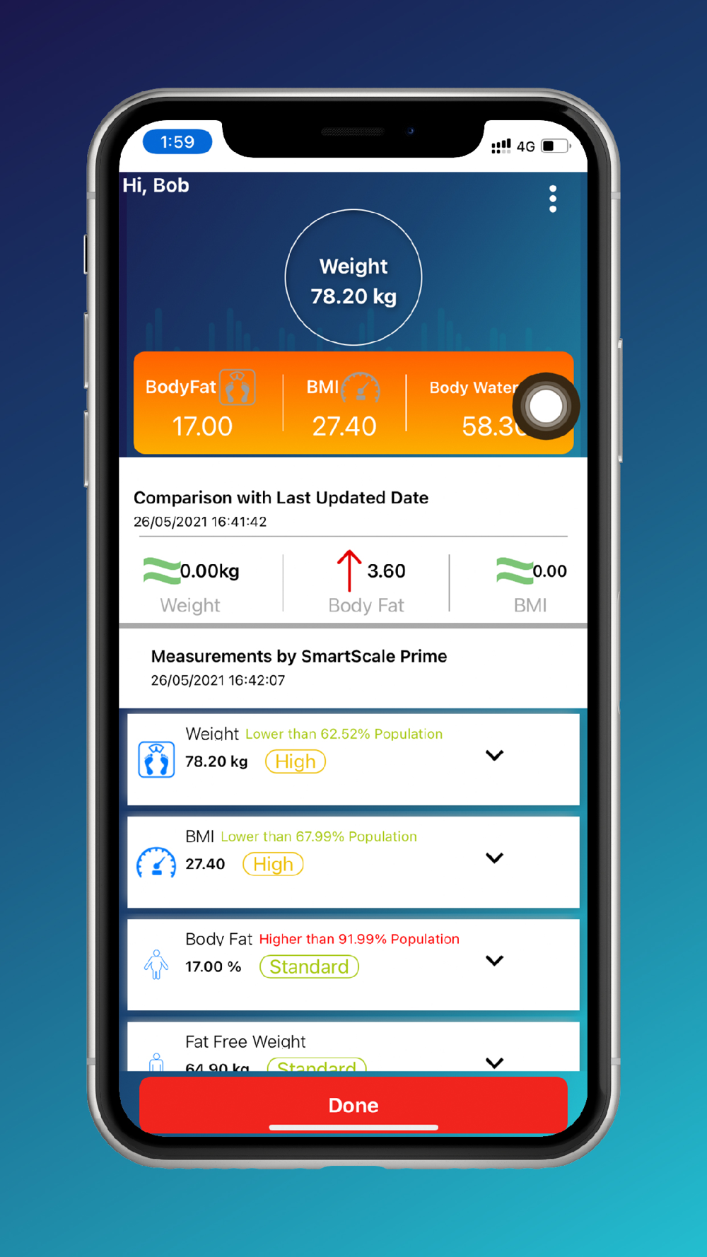 Percentile Score against the population: With over 1 Million readings on the Smartscale, we also provide a percentile index of the user against the other users who've used our scale for the similar profile, to give the user not just a universal zone, but also a more relative comparison of how his readings are in a more relative environment.