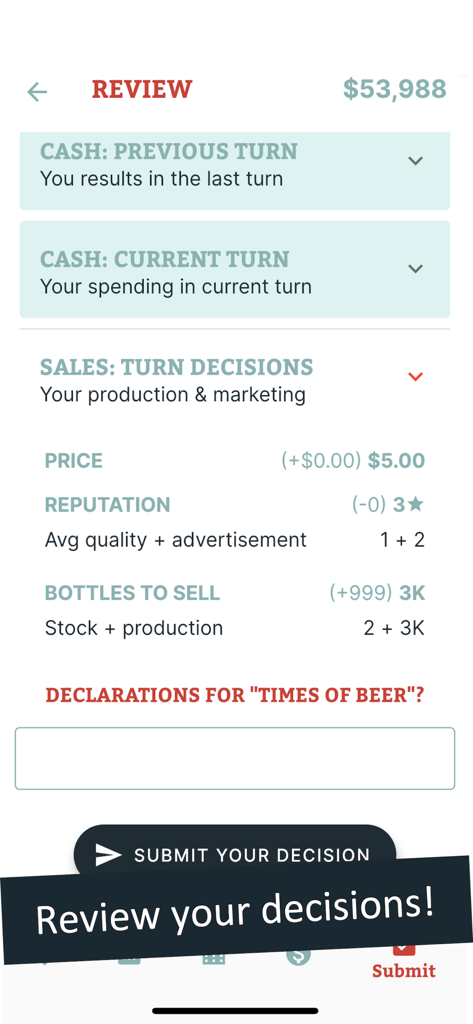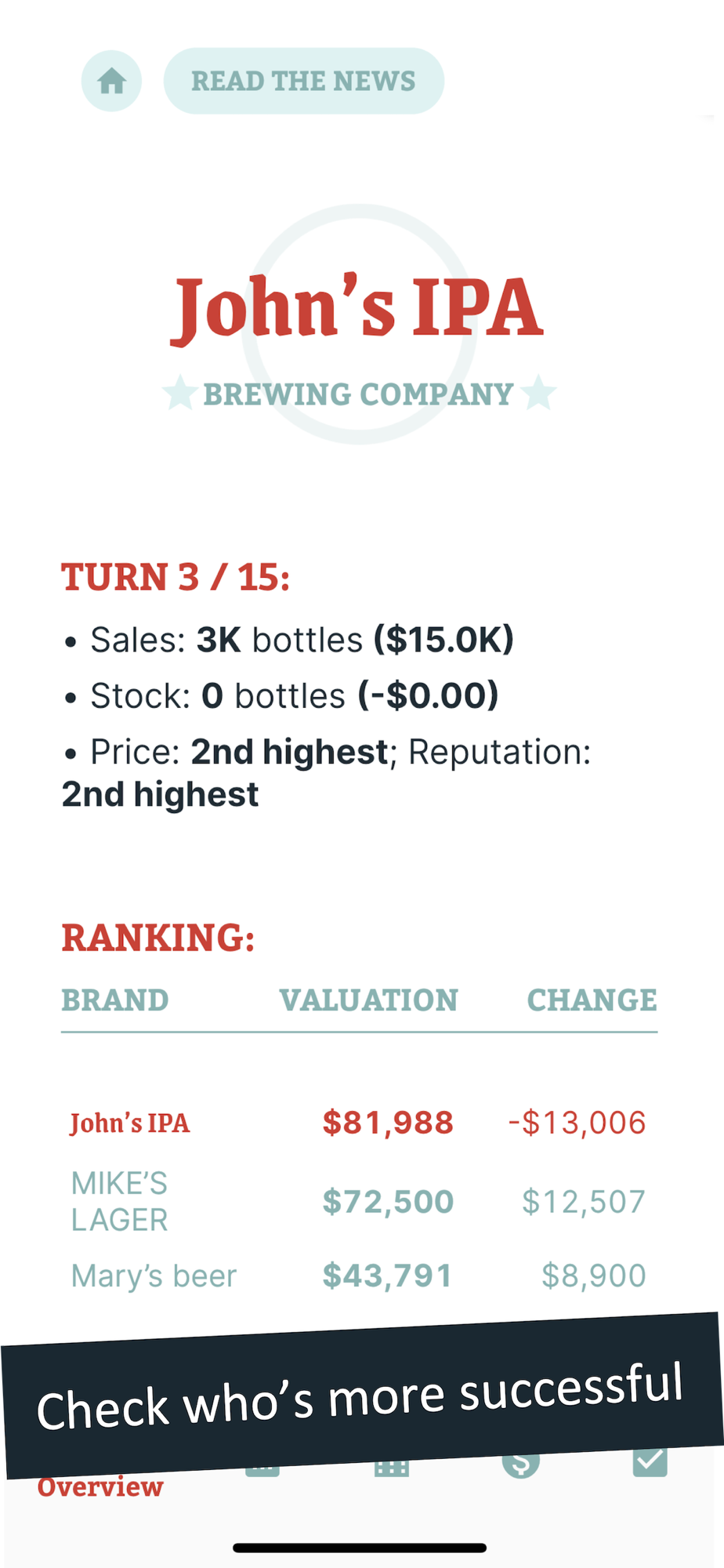 At each turn you and your friends will make decisions about how much to invest in the factory to expand production, improve quality or reduce costs. You will also decide how to price your beer and how much to spend in advertisement.