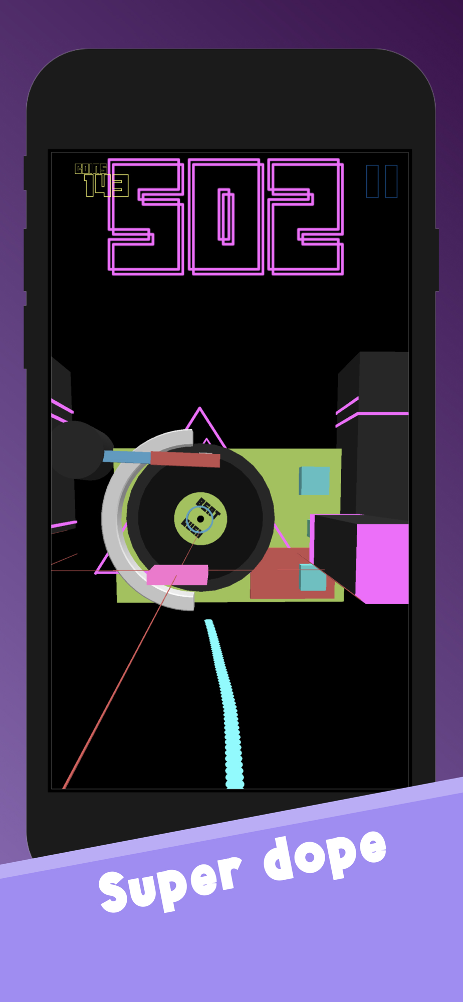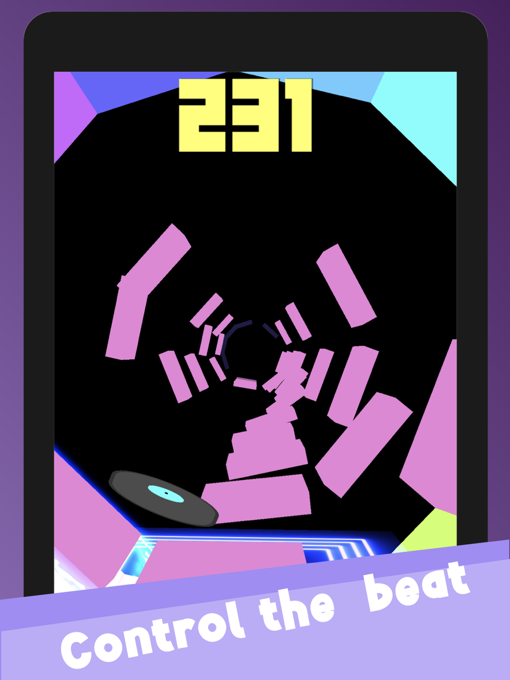 "In Super DJ, players get to become the DJ of an epic 3D party. It’s up to you to keep the music going by guiding the flying record through a trippy obstacle course filled with neon rings, blocks, and tunnels. Hovering over different colored blocks changes the tempo of the music, allowing you to create your own remix. Each block has a distinct sound so you can get really creative with each track.