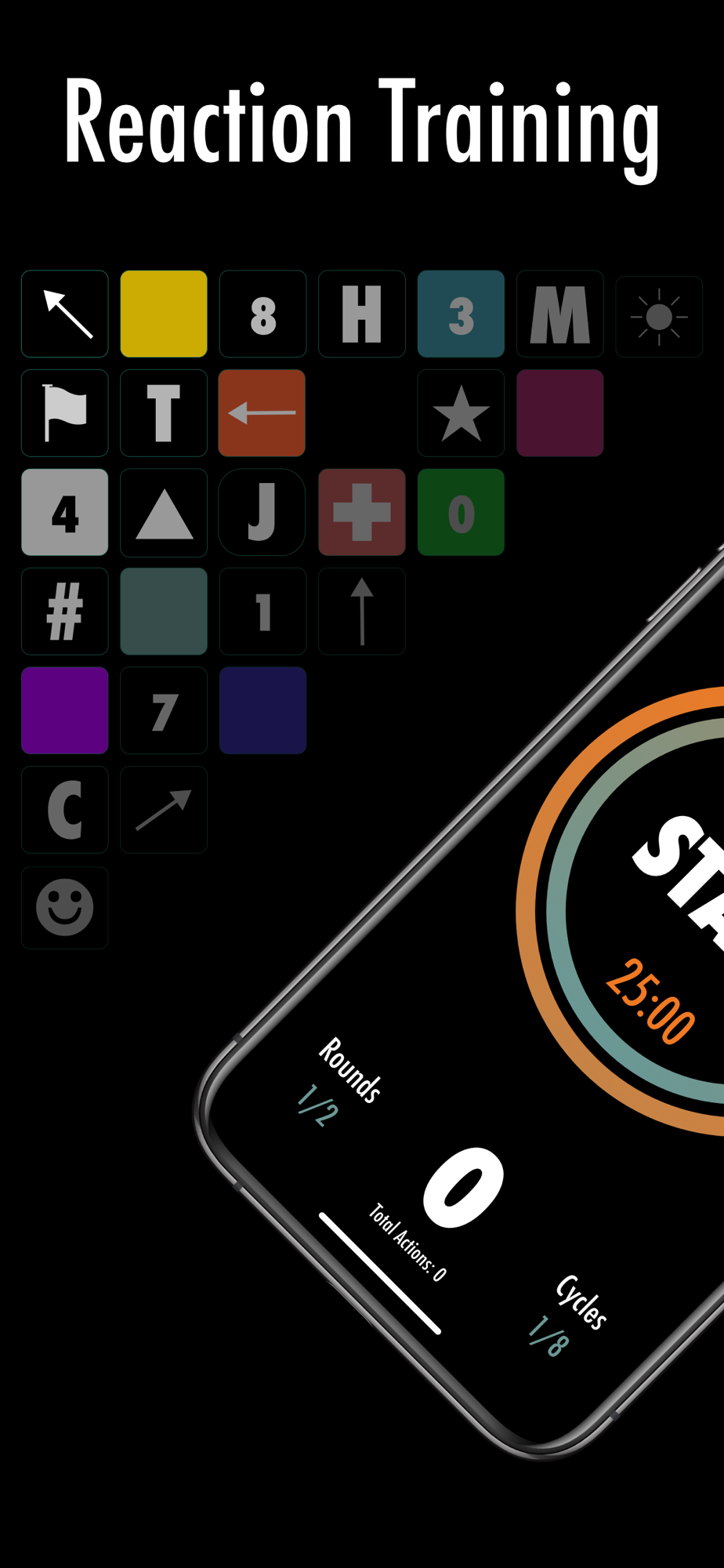 You can configure your reaction training as a normal interval based training, allowing you to configure the active and pause time for each round. You can also configure the interval timer to have multiple cycles allowing you to define different active and pause times for each cycle. For each cycle you are able to configure different reaction actions using Colours, Sounds, Arrows, Numbers, Letters, Images etc.