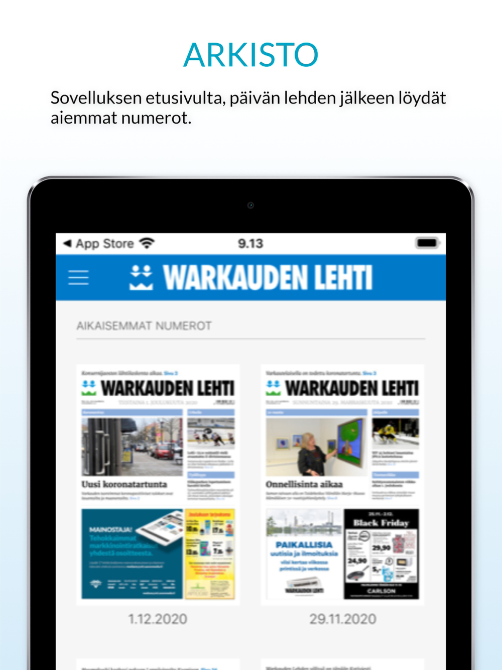 Sovellus sisältää uusimman julkaistun näköislehden sekä lehtiarkiston ja liitteet. Voit lukea sovellukseen lataamiasi lehtiä myös ilman verkkoyhteyttä missä vain ja milloin haluat.