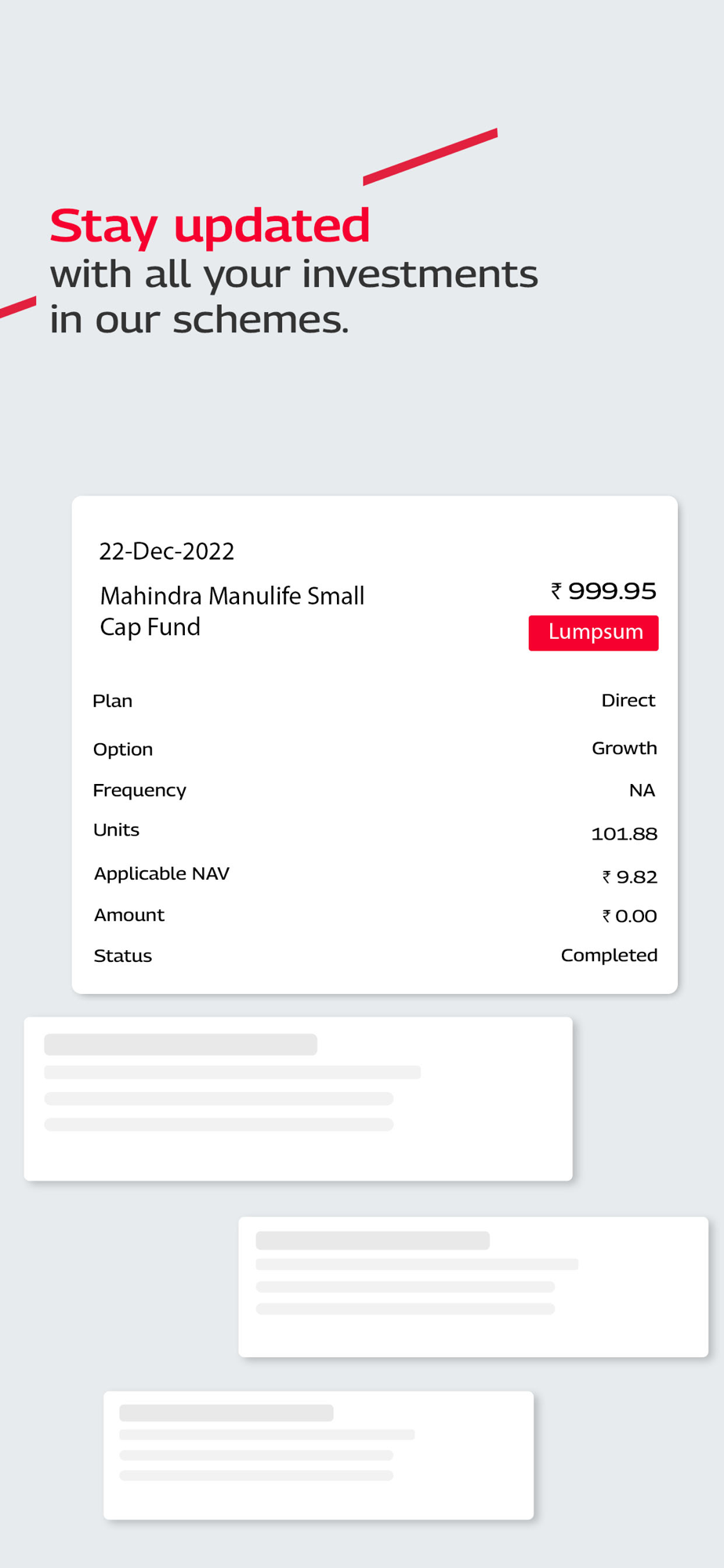 ● The app provides you the functionality to invest in the schemes from the Mahindra Manulife Mutual Fund by presenting you all the mutual fund schemes in a single scroll