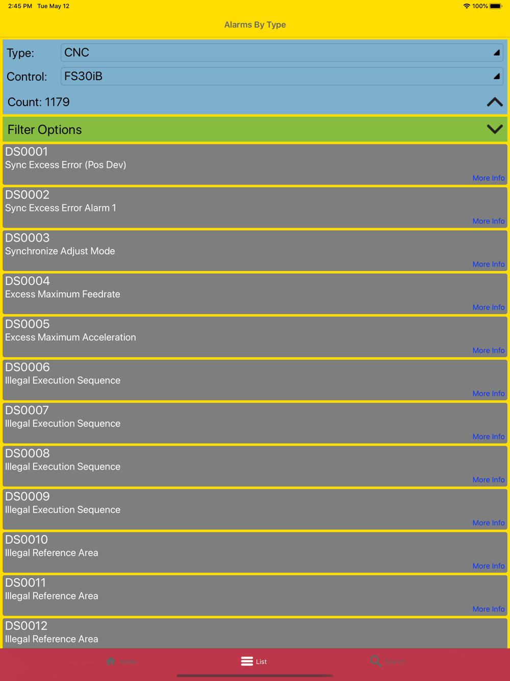 This tool is an invaluable tool to diagnose, look up and fix alarm codes for FANUC CNC's, Drive's, RoboDrill's, Lasers and devices. With the app you can look up alarm codes by name, search by text or hold the device camera to recognize an alarm code on a CNC screen. Tips are given to help fix problems that may be causing the alarm.