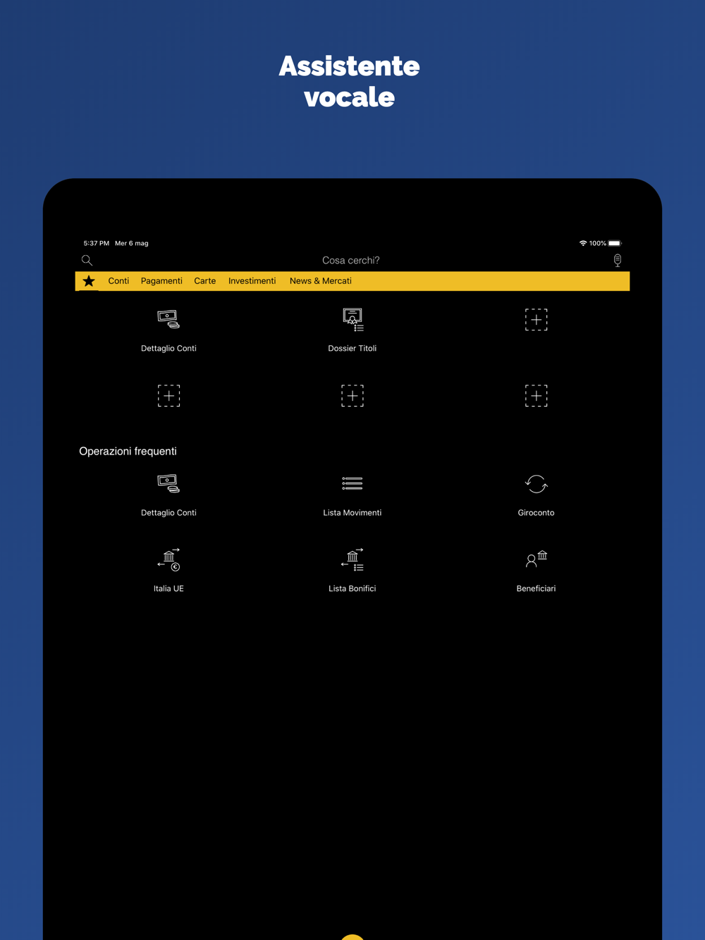 • Assistente vocale: utilizzo delle funzionalità di saldo, lista movimenti, documenti e bonifico tramite conversazione con l’applicazione.