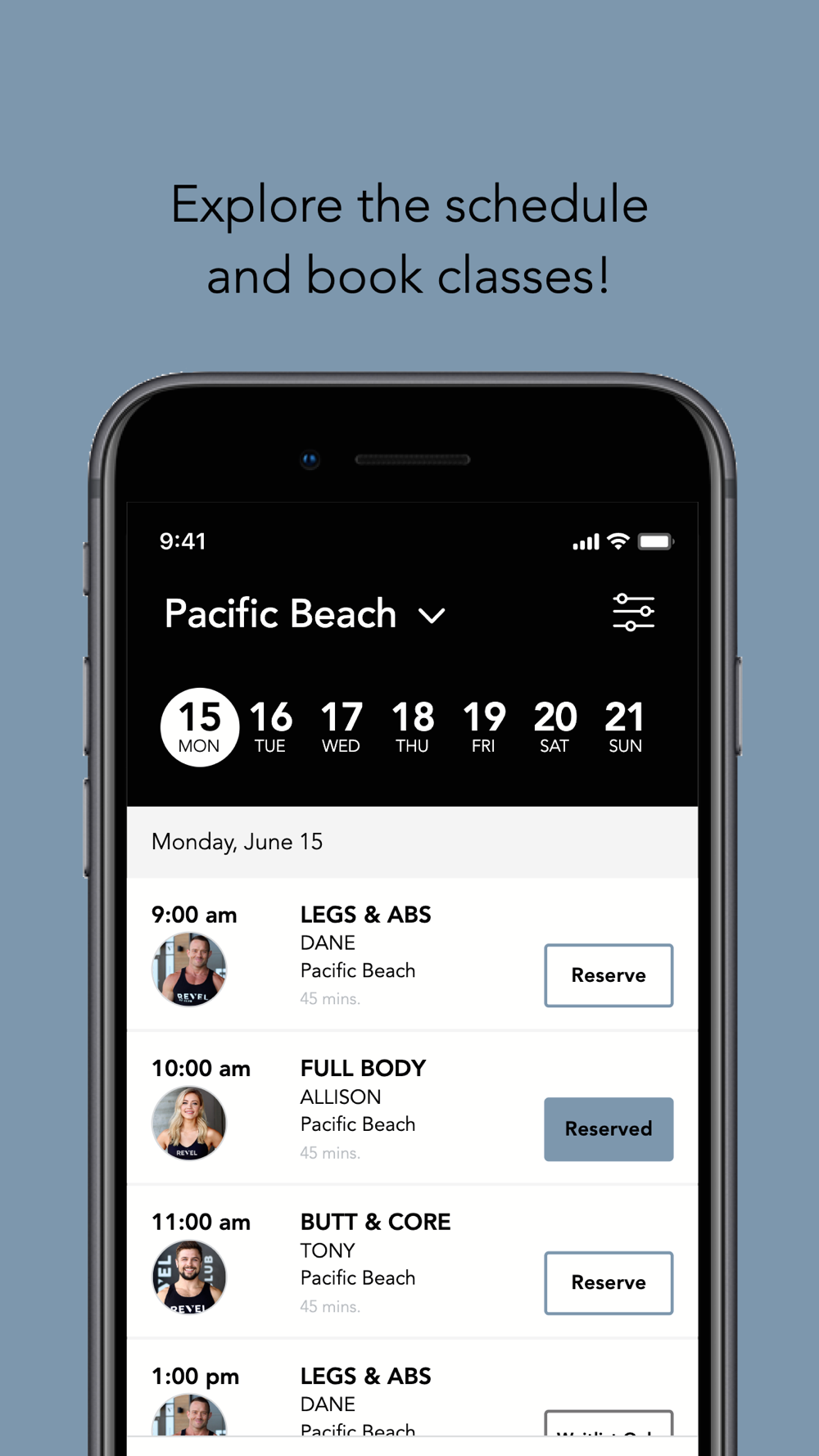 REVEL FIT CLUB It is a strength based, high intensity interval group training studio w/ lockers, showers, towel service and a smoothie bar. We host 50 min classes, on the hour. Clients alternate between the treadmill and the floor. If you are not feeling the cardio that day, you can always double down on the floor. Each day of the week is a different muscle pairing. We change the schedule every 12 weeks to keep the body guessing and so that you are never plateauing. During class we utilize dumbbells, kettlebells, resistance bands, TRX, medicine balls, the FitBench and TechnoGym treadmills. Our treadmills have regular, sled and parachute mode so that we are always working strength, power, and endurance. There are TVs throughout the room to assist with proper form and technique and so that you are never lost. Our trainers are the best trainers in San Diego. They write their own workouts, pick their own music, and have their own style. The best part about REVEL is that you will see and feel the results while having fun along the way. The music is loud, the lights are low, leave your worries at the door and you are good to go!