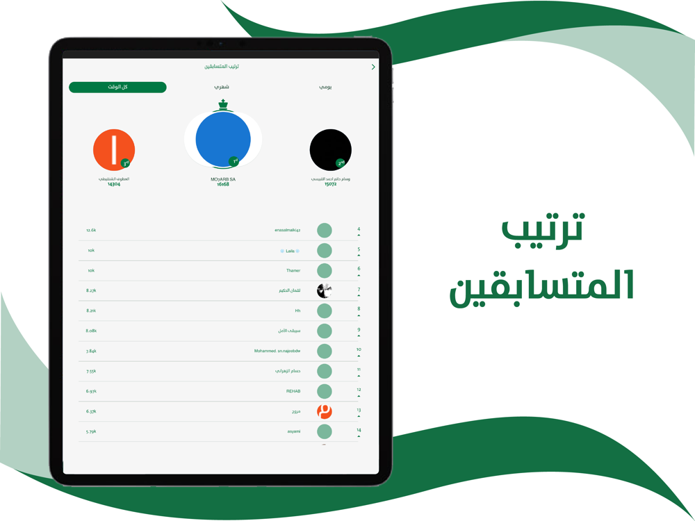 يقوم التطبيق بعرض أفضل المتسابقين يوميا وشهريا وكل الأوقات حسب أفضل النقاط.