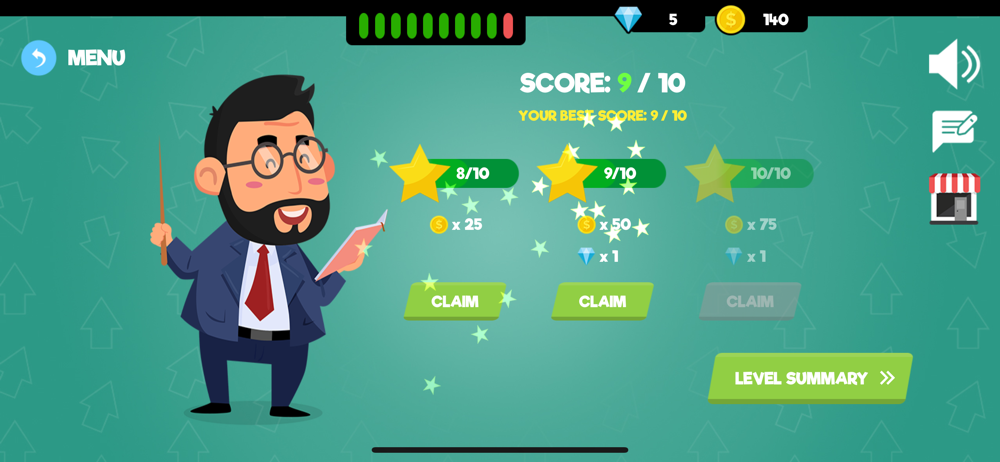 ◆ LEVEL SUMMARY ◆ where you can review your answers, reveal correct ones and learn more!