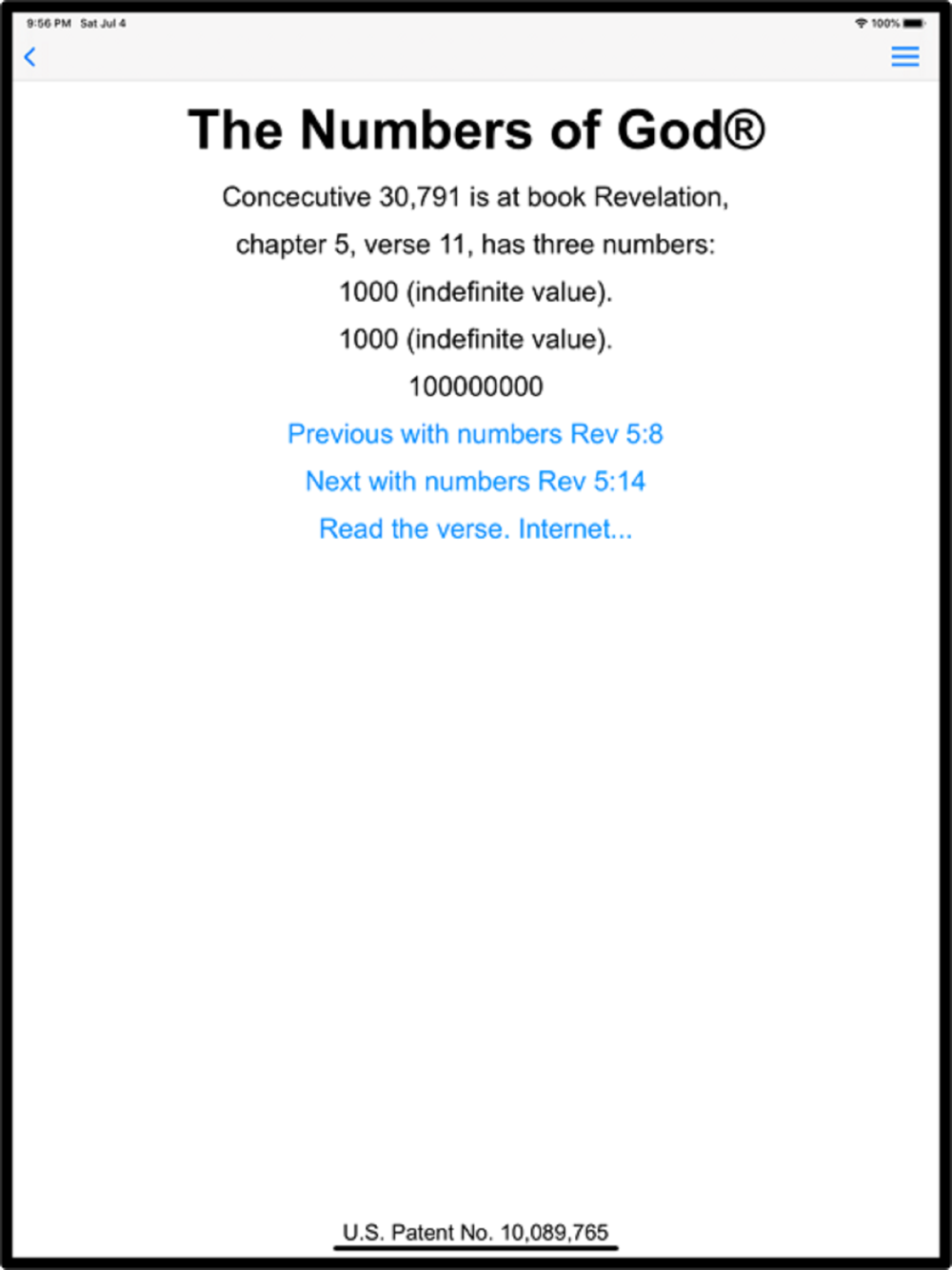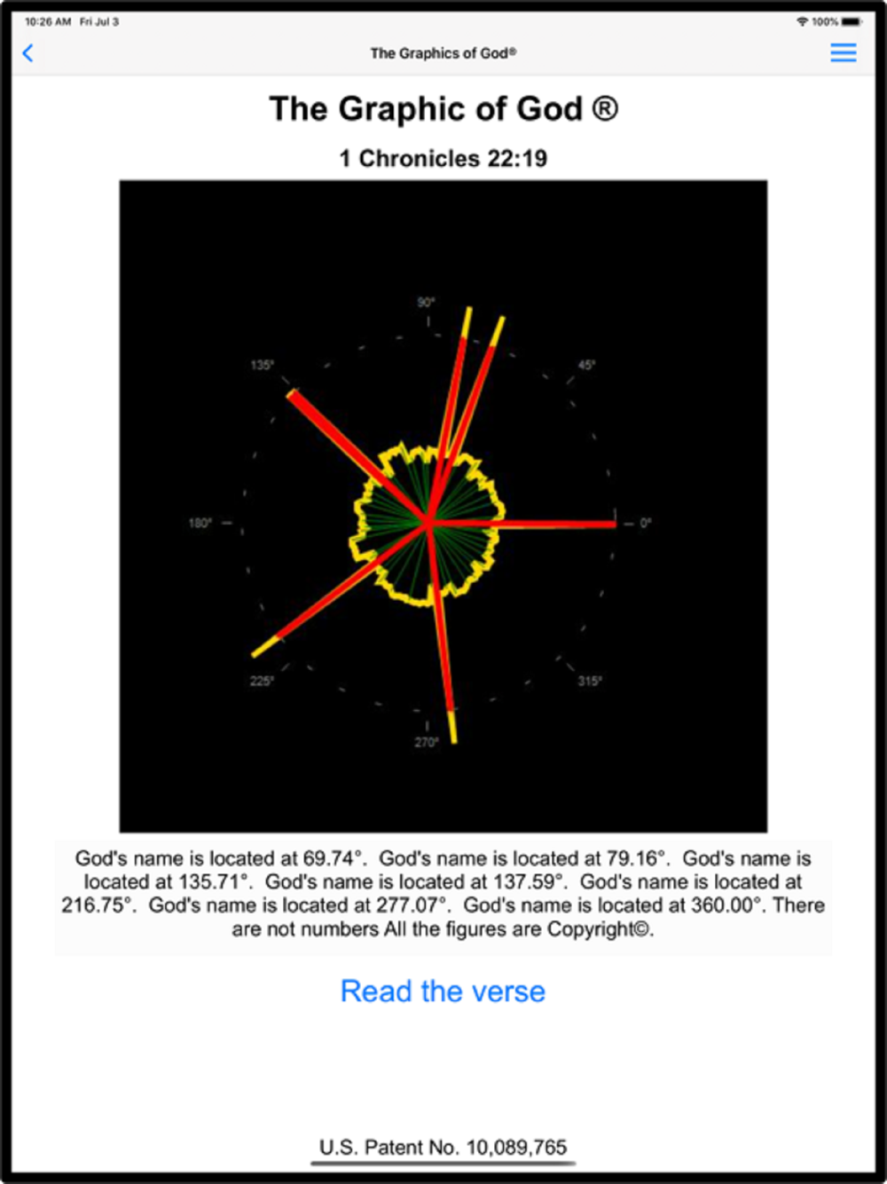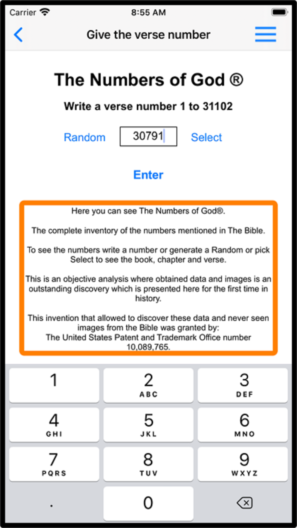 This software is an invention which was granted with the patent number 10,089,765 by The United States Patent and Trademark Office (USPTO). By means of the tools of this software it is possible to locate all the numbers mentioned in the Bible, have statistics, amazing data and never seen images. US Patent Office considered that this software isn´t only a useful tool to analyze The Bible but a novelty worldwide.