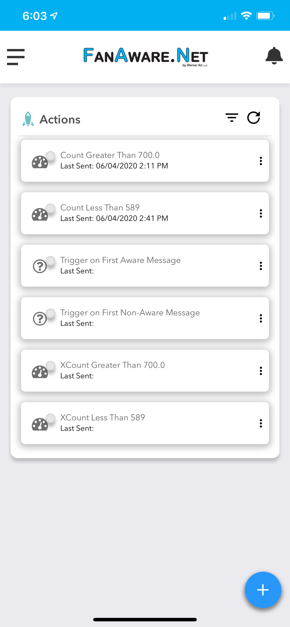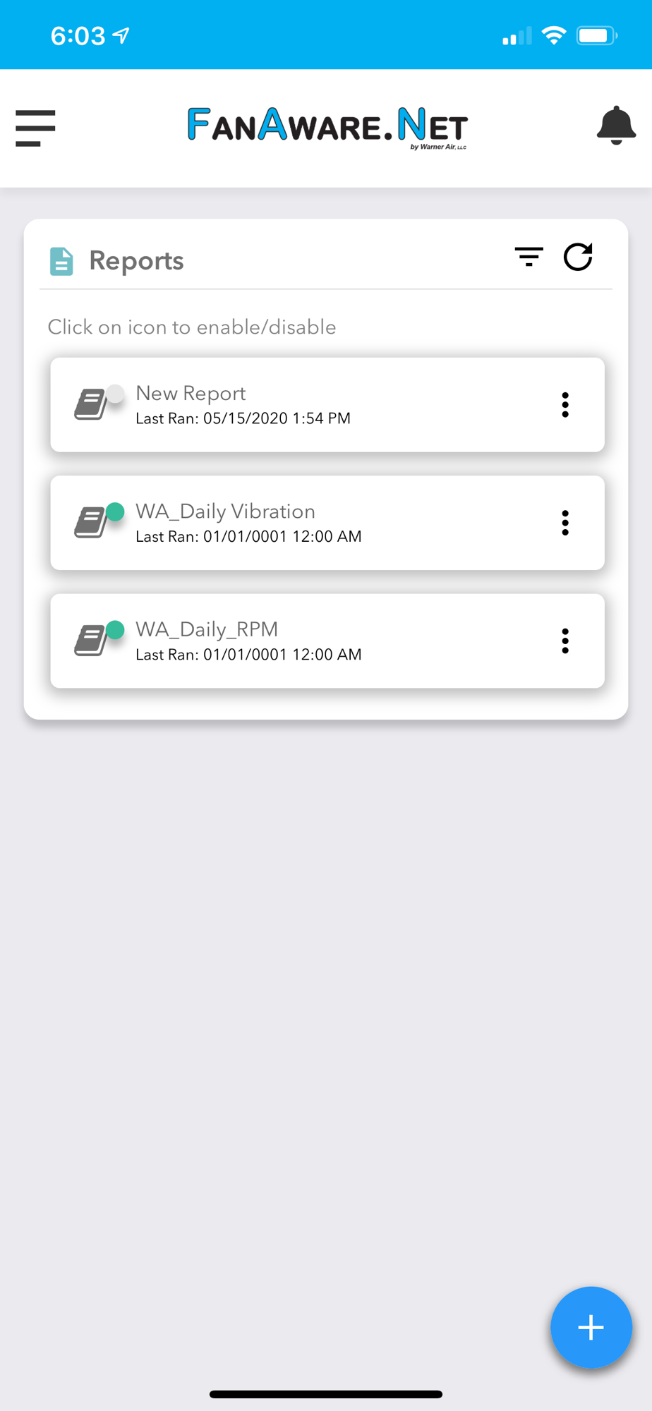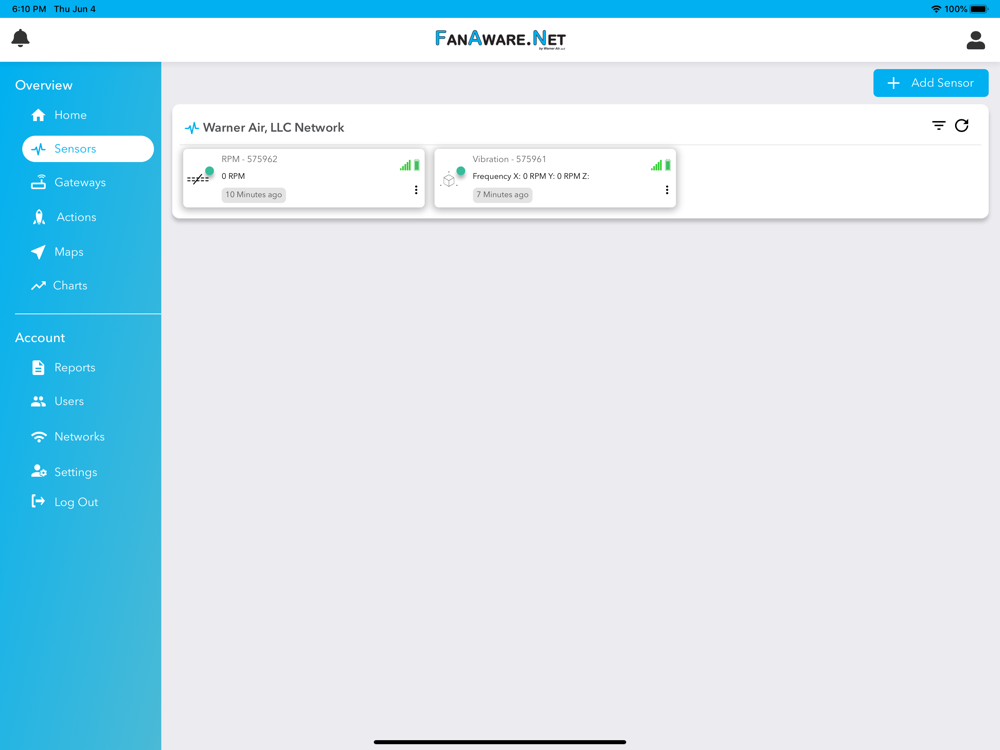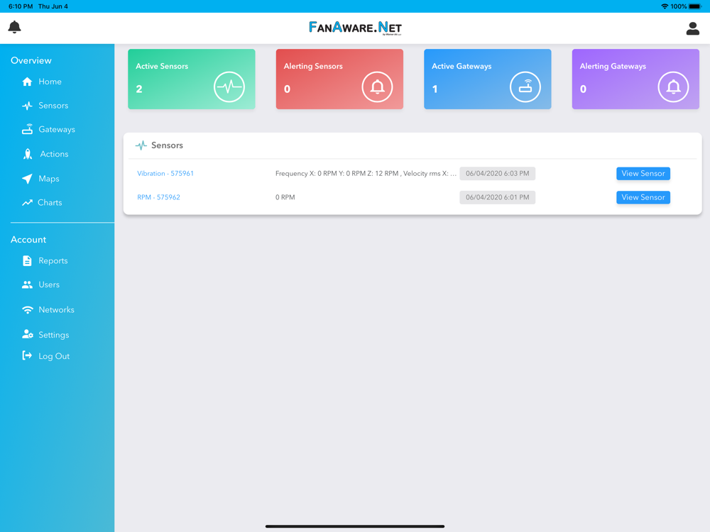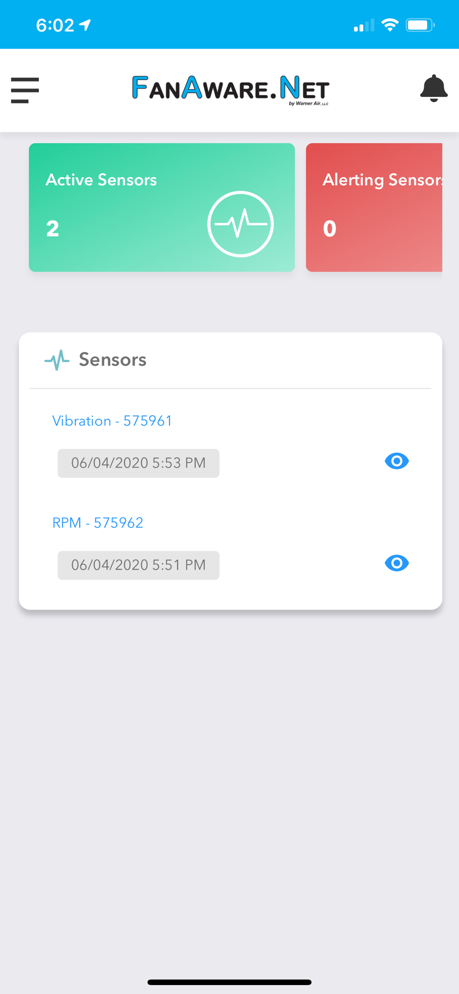 The FanAware.Net app is designed to give the user a mobile device view of our remote sensors, gateways and their associated notification systems. FanAware.Net specializes is remote fan monitoring of RPM, Vibration and Temperature.