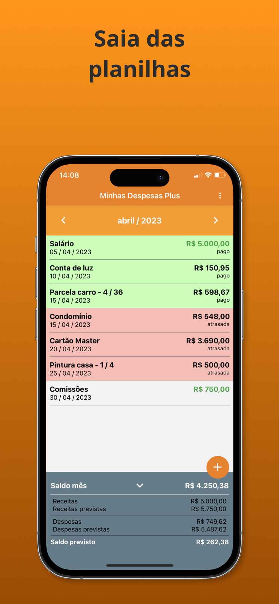 Initial Screen - is where the expenses and revenues of each month are listed. Lines with a red background indicate that you are behind schedule. The green line indicates that the movement has already been downloaded, that is, paid or received. To do this, you need to click on the line opening the detailing screen, the "enjoy" button indicates the payment / receipt or undo.