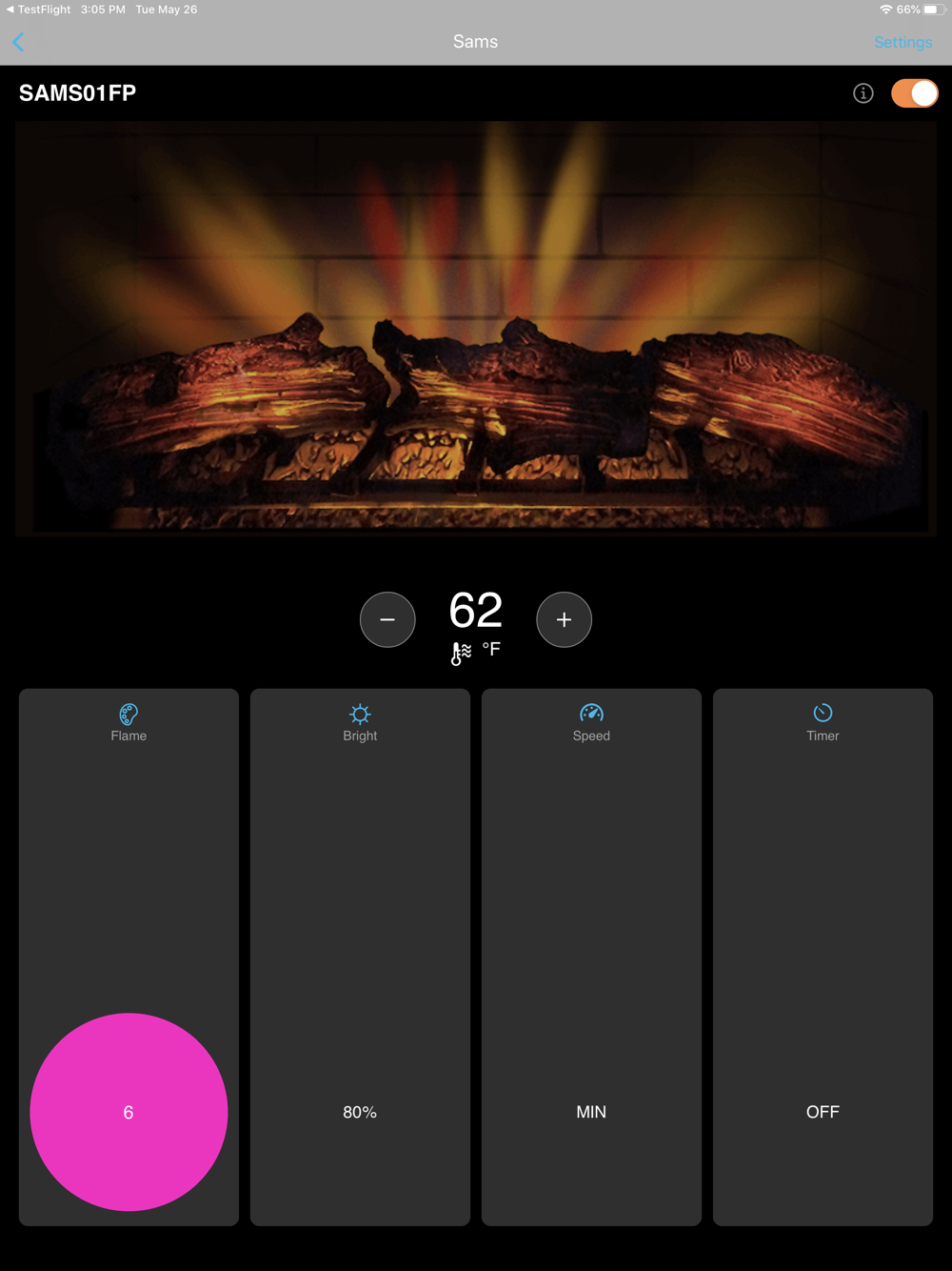 - Turn the fireplace on or off