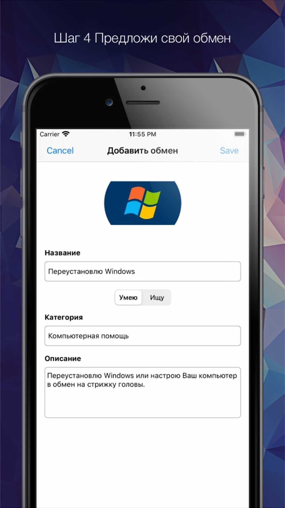 Например, ты умеешь делать стрижку и собираешь на поездку в Европу, но не знаешь английский язык ... не проблема — предложи другому участнику со знанием английского выгодные условия обмена! И половина твоей цели уже пройдена!