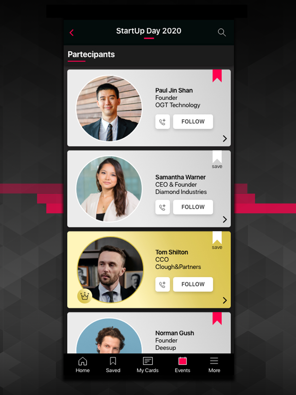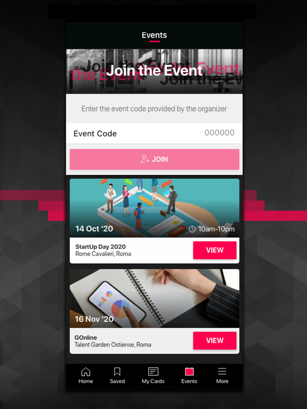 Create a personal profiles that act as “Digital Business Cards” and personalize it by including name, title, bio, role, mail, contacts and social media. Send your details to others event attendees to connect and create meaningful relationships by a simple swipe.