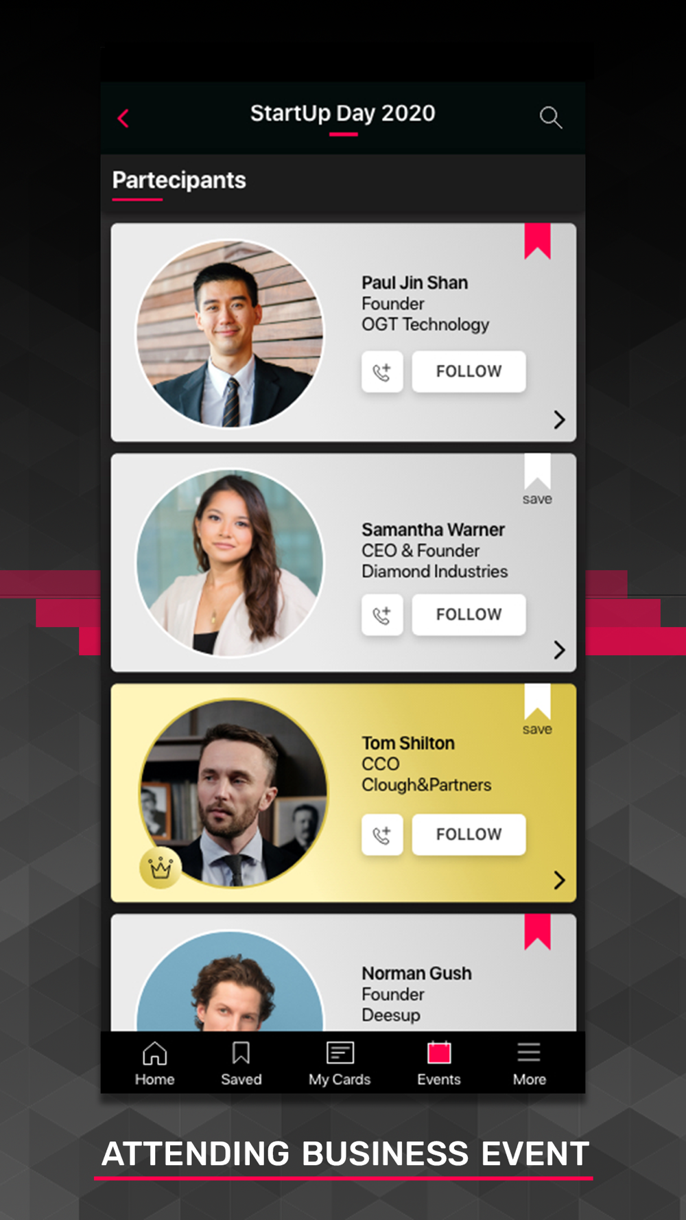Discover who is at the event, or nearby you at that moment. Plan in advance whom you would like to meet and be notified as soon as he or she are close to you.