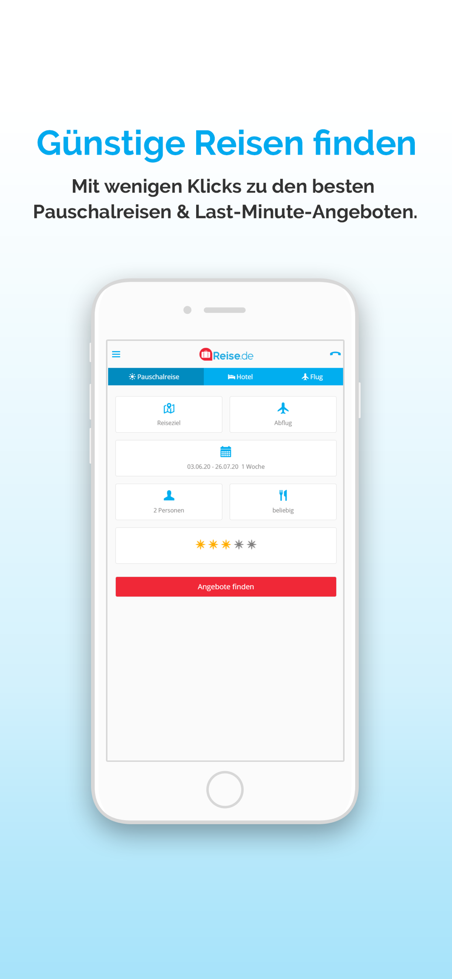 Find the best travel deals online - conveniently with the free Reise.de app! Get the anticipation on your mobile phone and let yourself be inspired by dream beach destinations, picturesque nature and culture-rich city breaks ! At Reise.de you can expect package holidays, last minute deals, top hotels, cheap flights and regular travel deals.