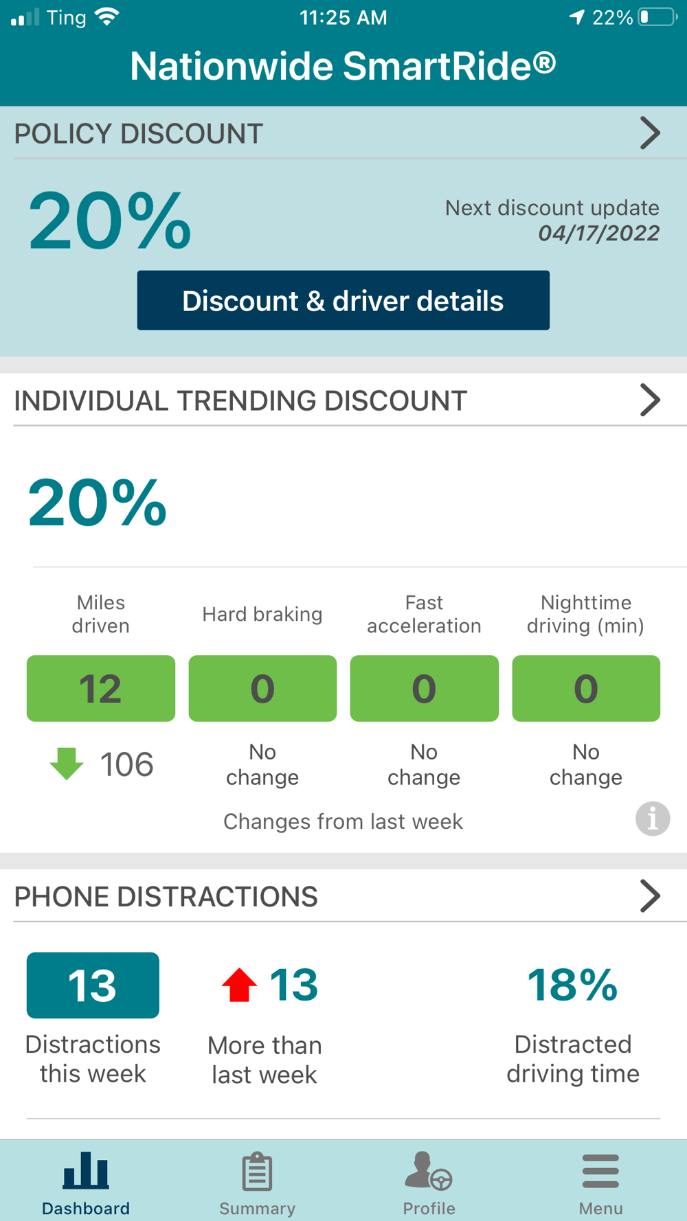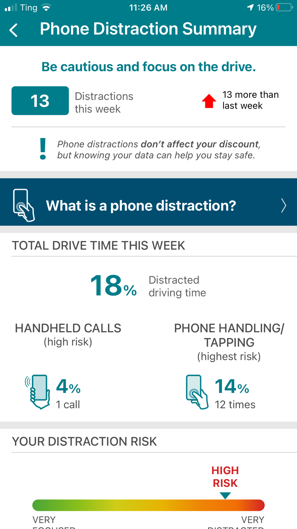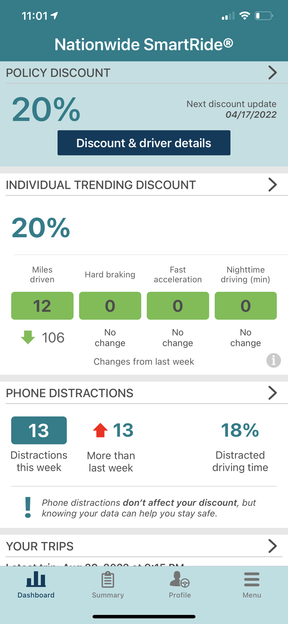 As part of our ongoing efforts to reduce distracted driving, the SmartRide Mobile App also keeps track of how often you interact with your phone while your vehicle is in motion. Phone distractions don't affect your discount, but knowing your data can help you stay safe.