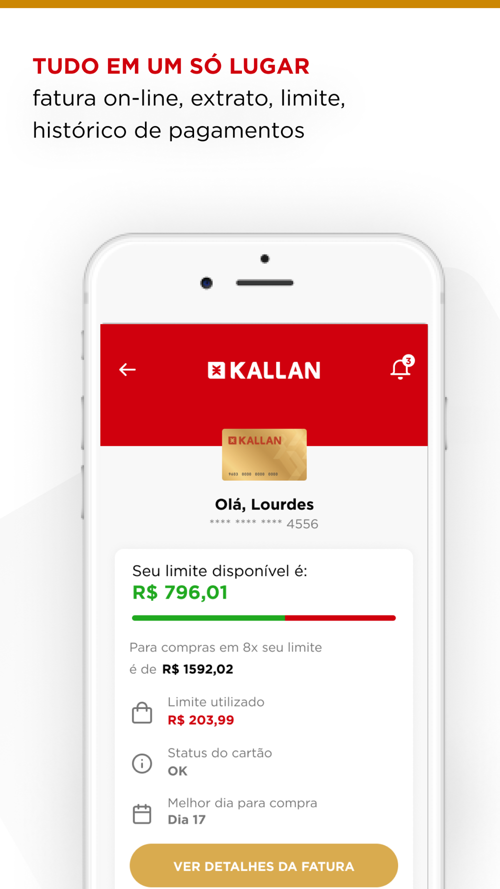 Com o aplicativo do Kallan Card, você pode realizar compras, consultar seus limites, ver seu histórico de transações, controlar seus gastos, lembrar onde eles aconteceram, e ficar por dentro de promoções da Rede Kallan. Tudo isso de maneira prática e rápida.