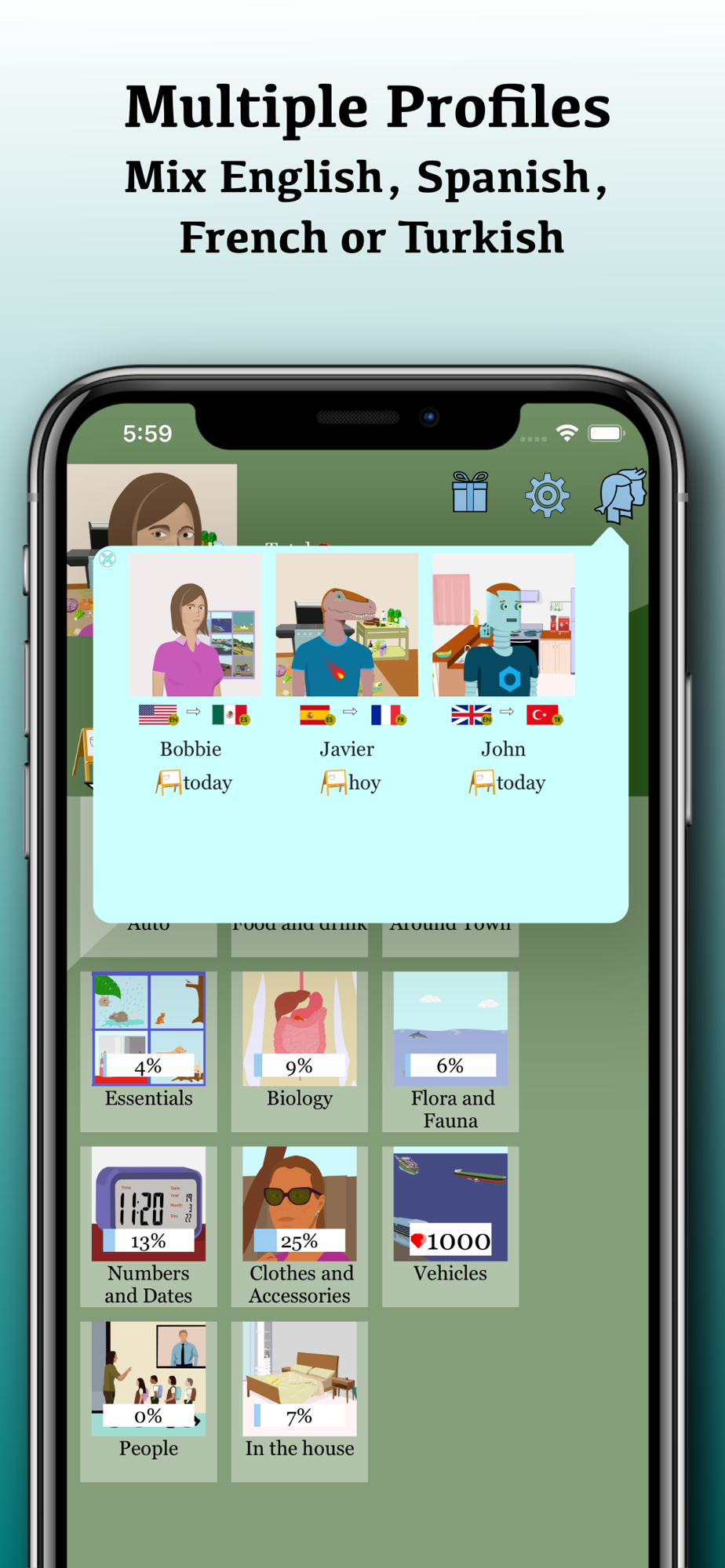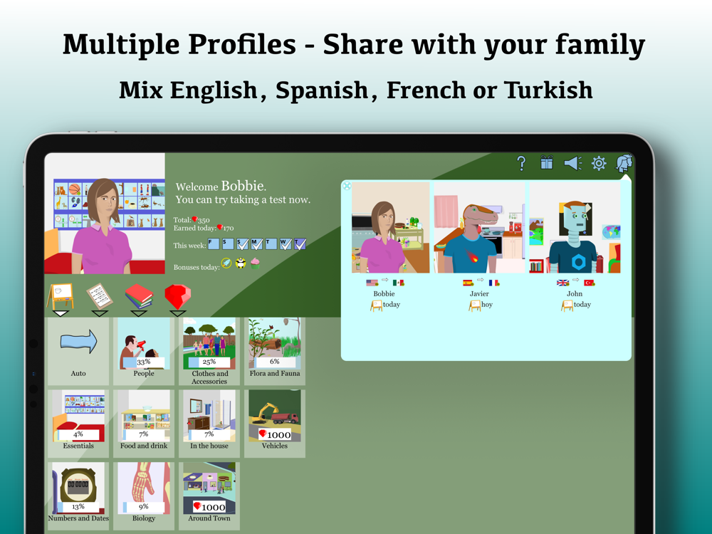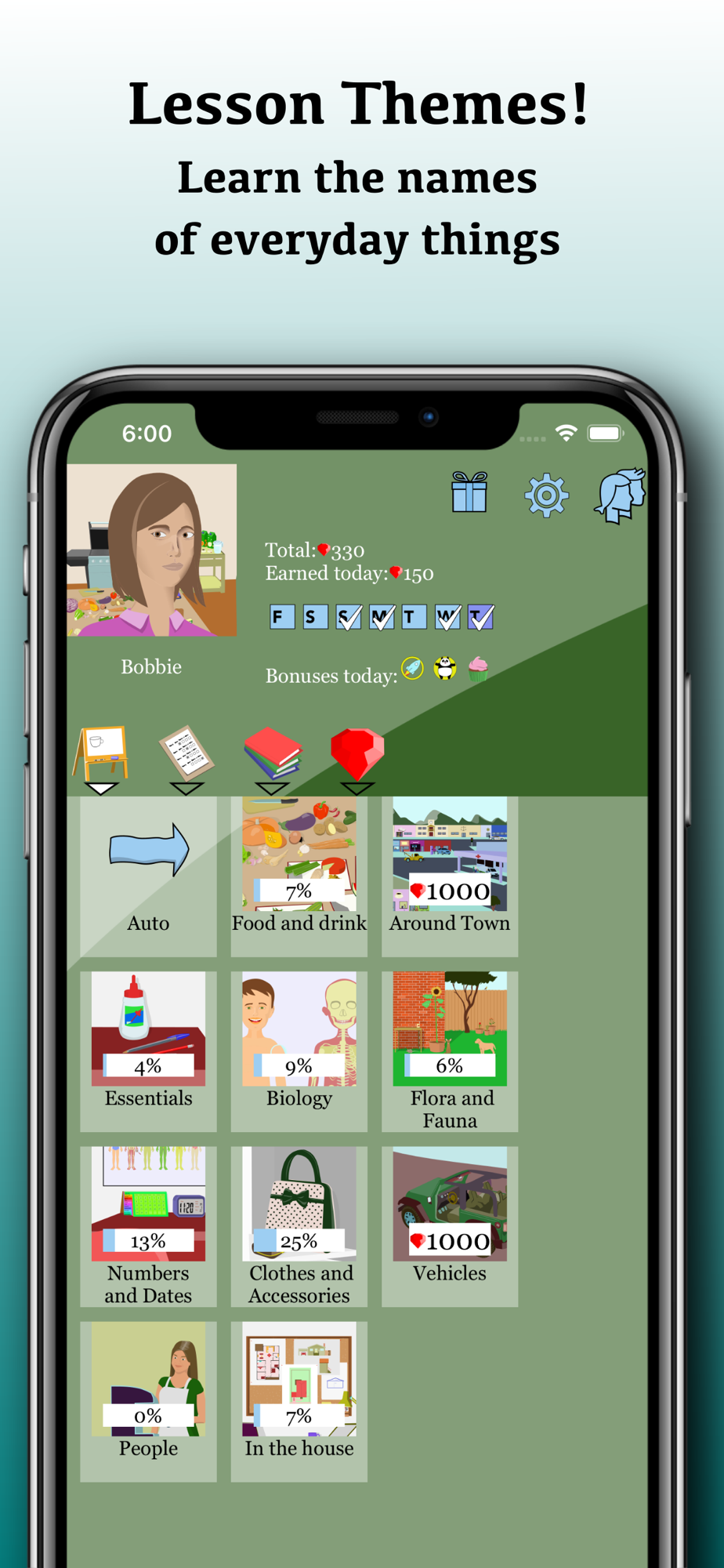 The more lessons and tests you take, the more Gems you earn. Use your Gems to unlock even more words, get cool avatars or use awesome themes.