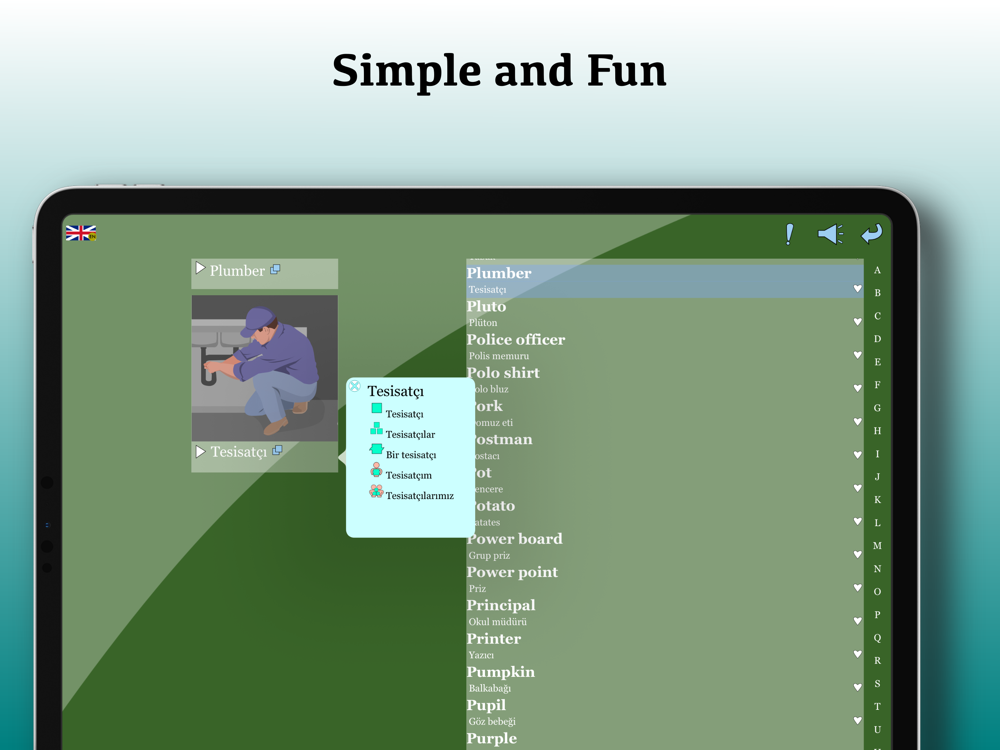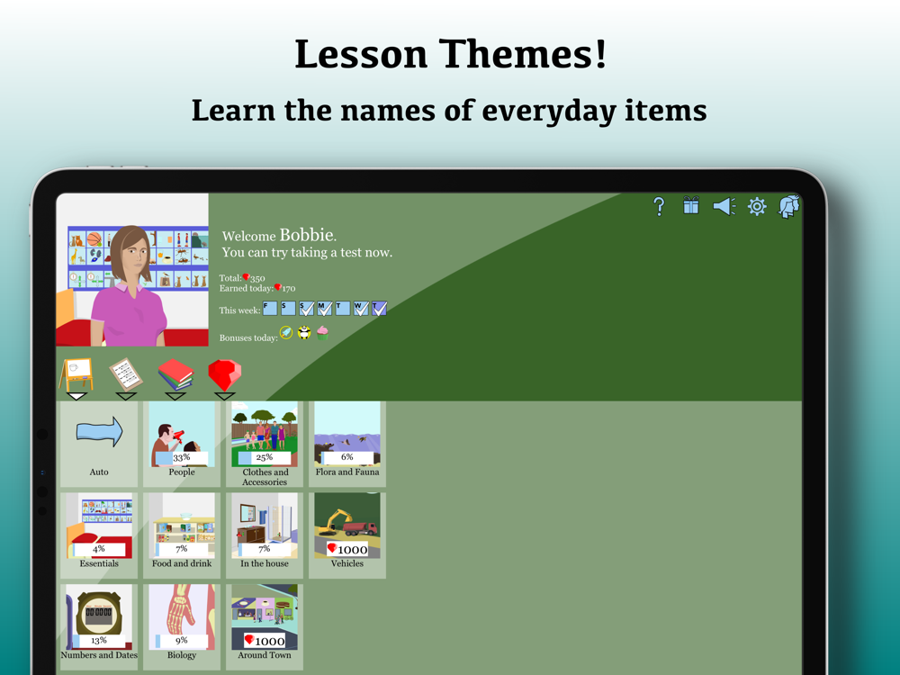 Personalised lessons and tests help expand your vocabulary using pictures grouped by theme, such as Food or Clothes. Lessons start in the home environment, teaching you the names of everyday items.