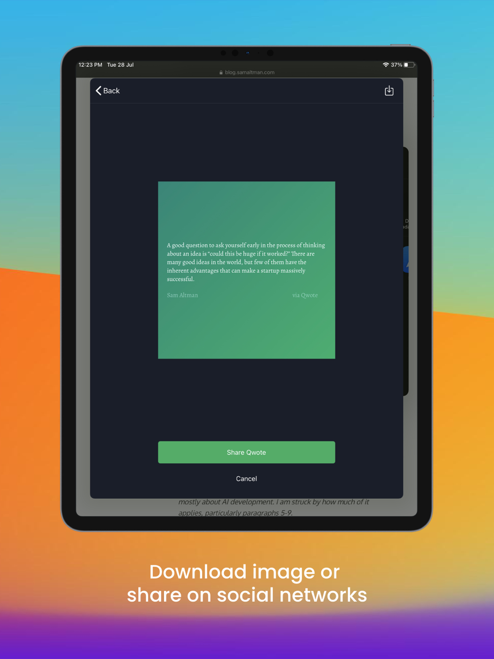 - Then click 'Share Qwote' to share your beautifully formatted card on social networks