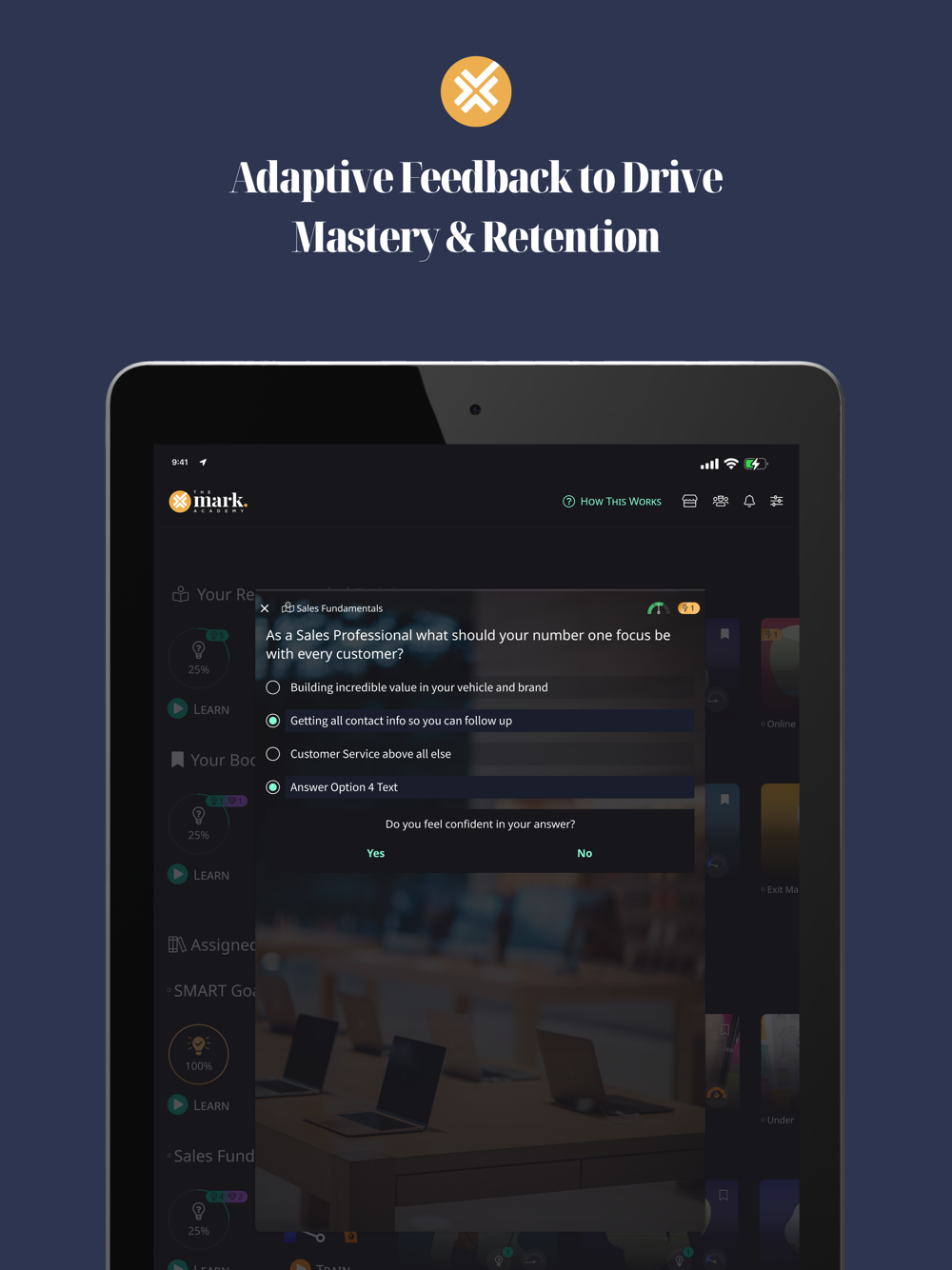 As a learner, simply answer the question, indicate how confident you are in your answer, and learn from your answers. The Mark Academy improves the retention of subject materials over time and is an excellent tool for Retail Automotive training. The Mark Academy’s proprietary algorithm calculates each learner’s individual learning/forgetting curve, reintroducing content over time to improve retention.