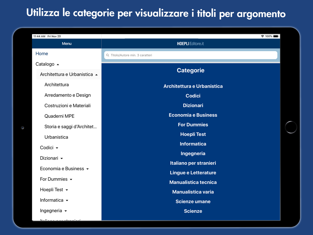 L’interfaccia dell’app è stata progettata per fornire un’esperienza semplice e intuitiva. Una casella di ricerca nella pagina principale consente di cercare rapidamente per autore o titolo. Un menu principale attivabile tramite l’icona in alto a destra sullo schermo consente di affinare la ricerca selezionando la categoria di interesse.