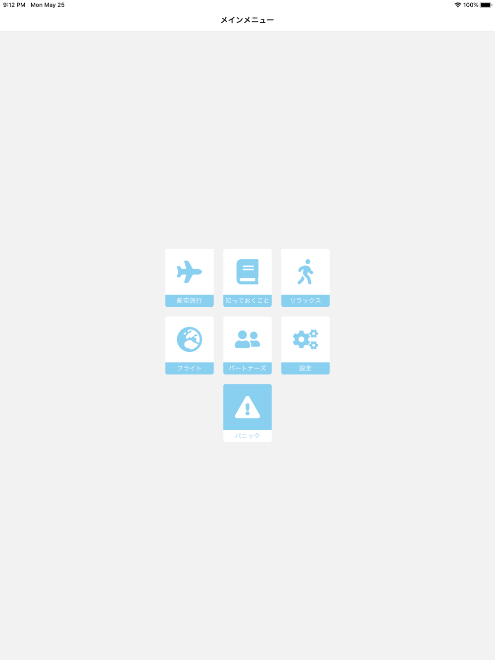 「航空旅行」、「知っておくこと」、「リラックス」、「パニック」、「情報」
