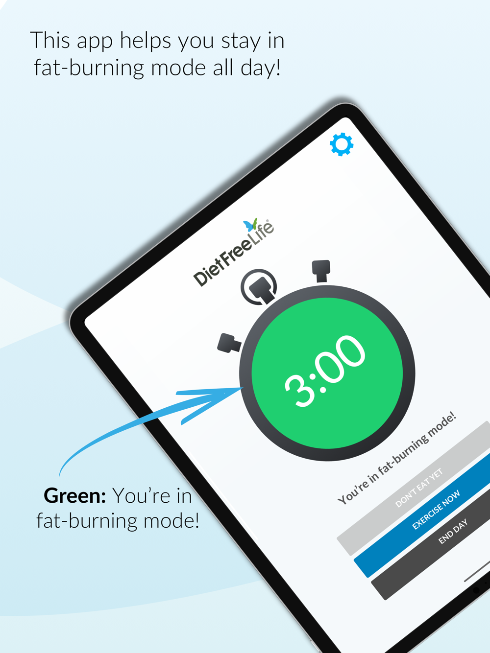 Every morning around your wake up time (at a time specified by you) you will receive a notification reminding you to eat or exercise within an hour. Tapping a button in the app every time you eat or exercise resets the fat-burning timer. Repeating this simple process throughout the day makes it easy to stay in fat-burning mode all day long!