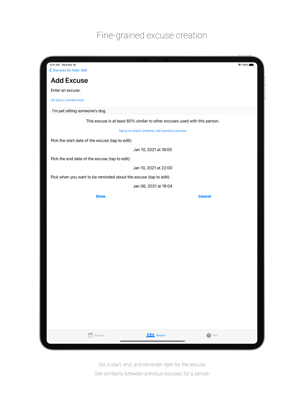 - Set a start date, end date, and reminder date for the excuse