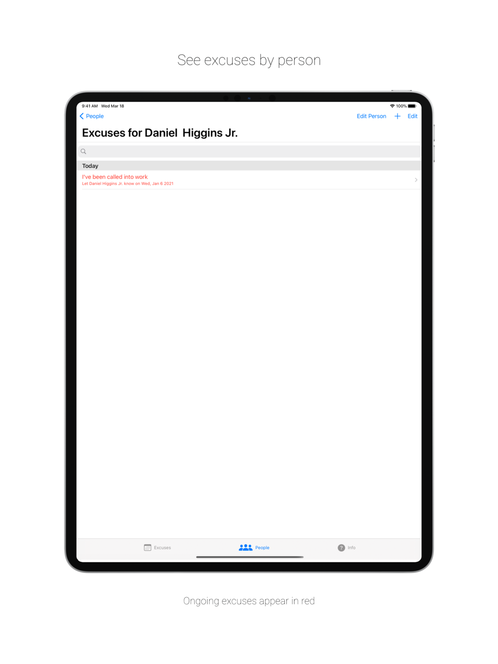 - View all excuses, or view all excuses for a specific person