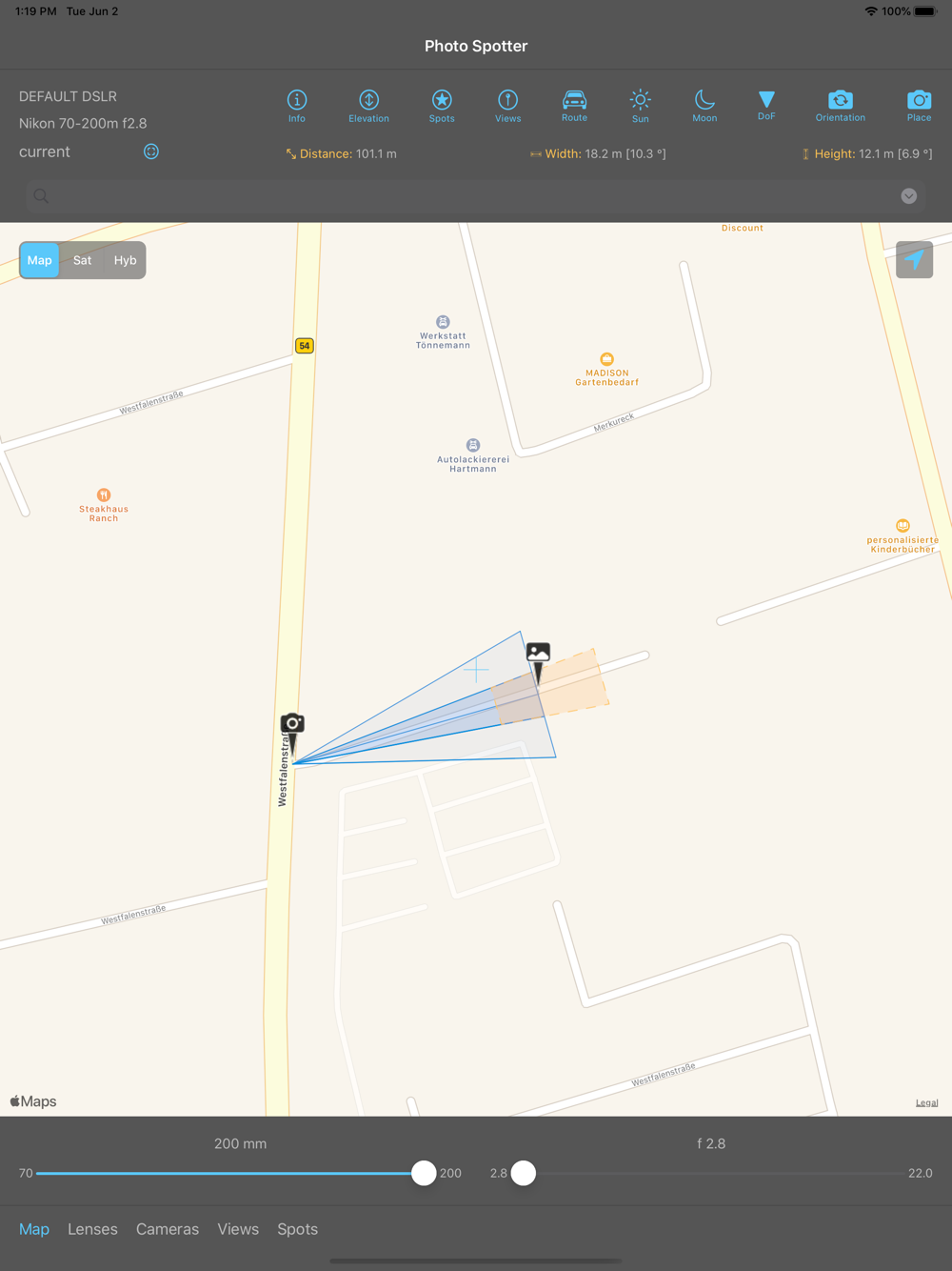 PhotoSpotter helps you to mark your favourite locations either only by set a spot marker without additional information or directly as a view. In the view you can set the camera, lens, focal length and aperture for you favourite shot at the selected location. You can add multiple camera bodies with their sensor size and also your lenses for the different bodies (e.g. APS-C lenses for APS-C bodies etc.).