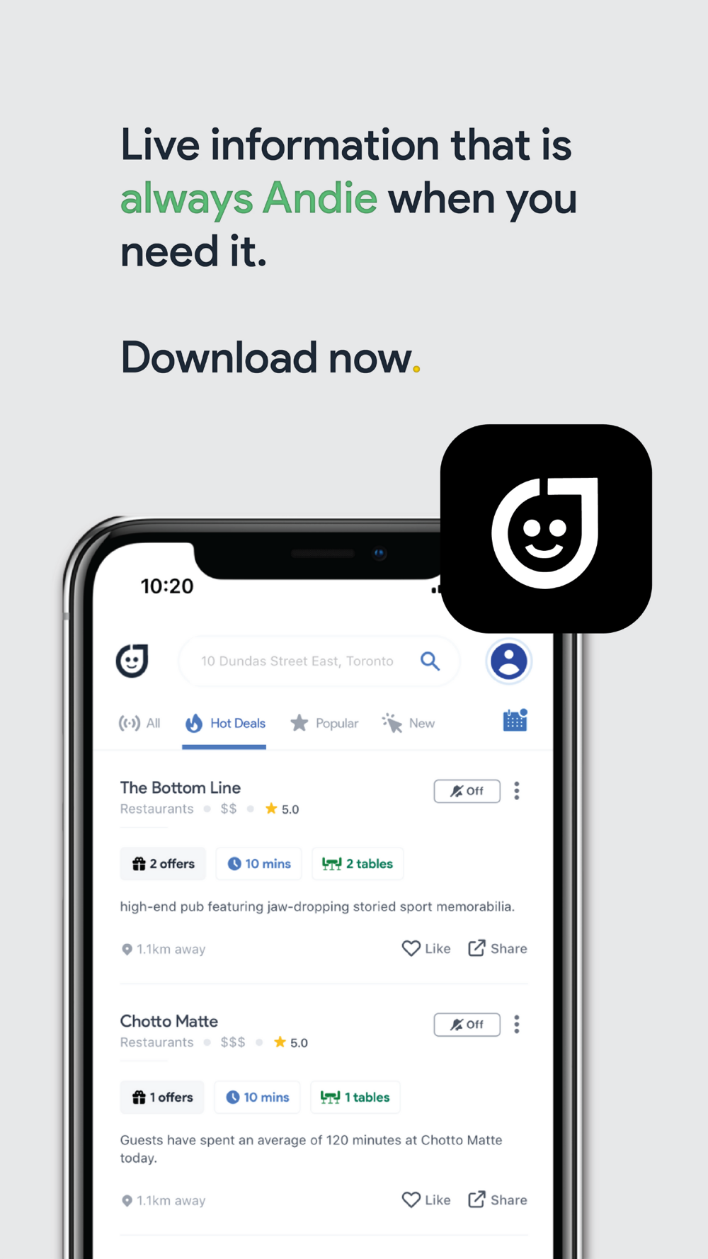 Andie is the free live information app that helps you explore restaurants, bars, retail and grocery stores near you, in real-time. Whether you’re making last-minute dinner plans with friends, heading to the mall, or picking up groceries, Andie partners with businesses to provide you with live information such as wait times, capacity, lineups, limited-time deals and offers, that help you decide when and where you go.