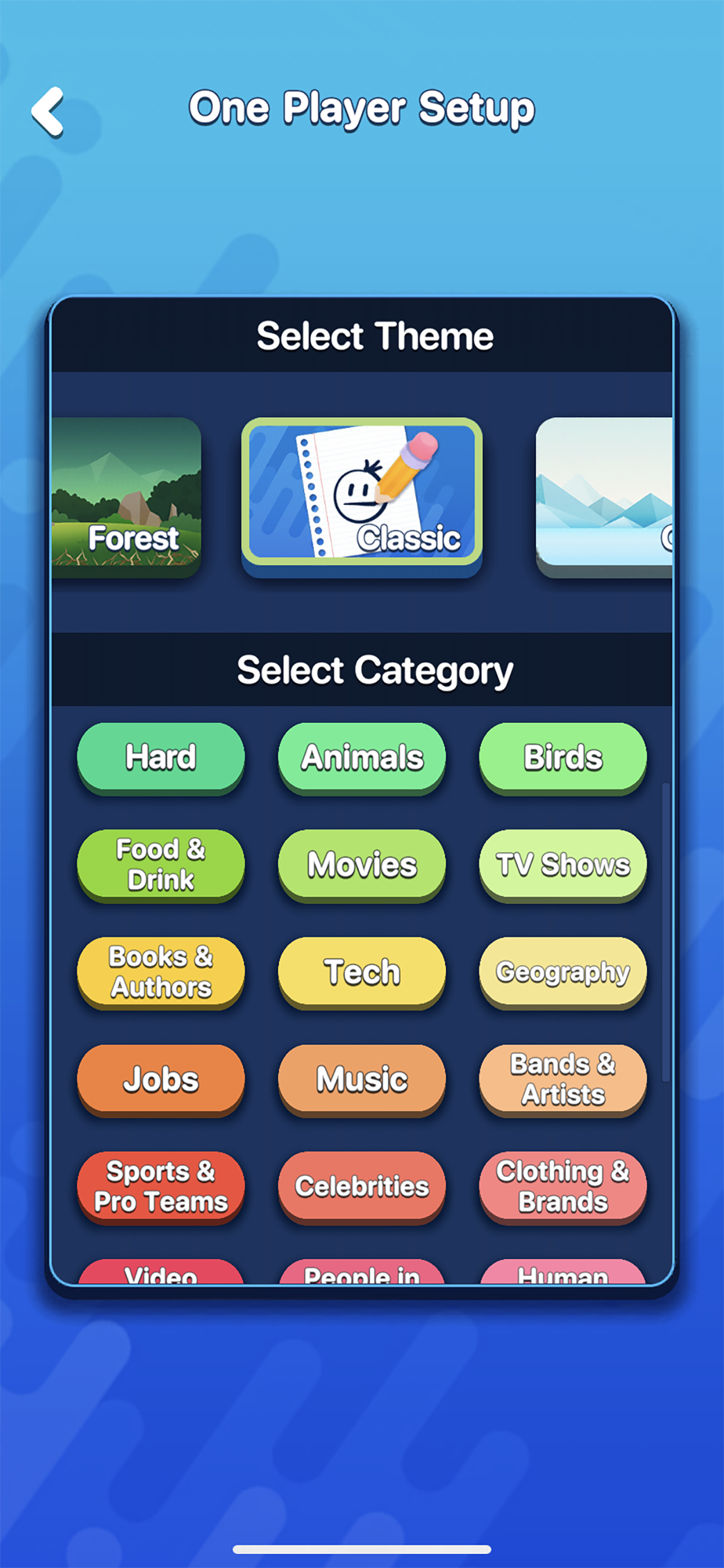 - Awesome and fun themes. Classic theme for familiar gameplay, or one of the others for a fun new take on Hangman.