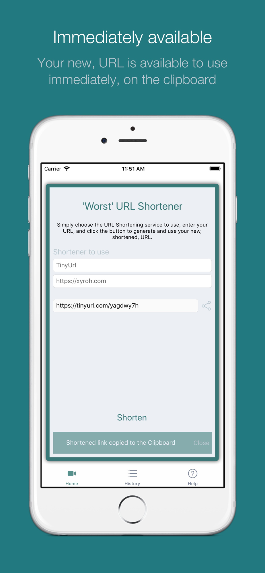 The 'Worst' URL Shortener is a quick, fast link shortening app allowing you to choose from a variety of url shortening services, and convert that long, cumbersome URL into something short and far easier to communicate, or just save it to your URL History and reuse it later