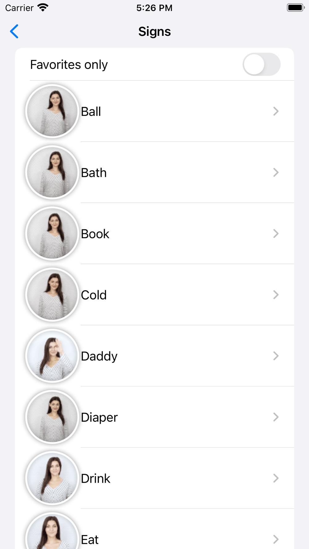 - Save signs you want to teach baby in your favorites list so they are easy to pull up when you need them