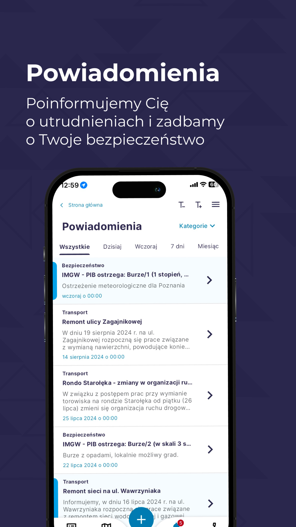 Zyskasz dostęp do aktualnych informacji odpowiadających Twoim zainteresowaniom i nie umknie Ci nic, co związane z Twoją okolicą. Od Miasta Poznania otrzymasz najważniejsze powiadomienia i przypomnienia w zakresie prac drogowych, awarii, zmian w komunikacji miejskiej i innych.