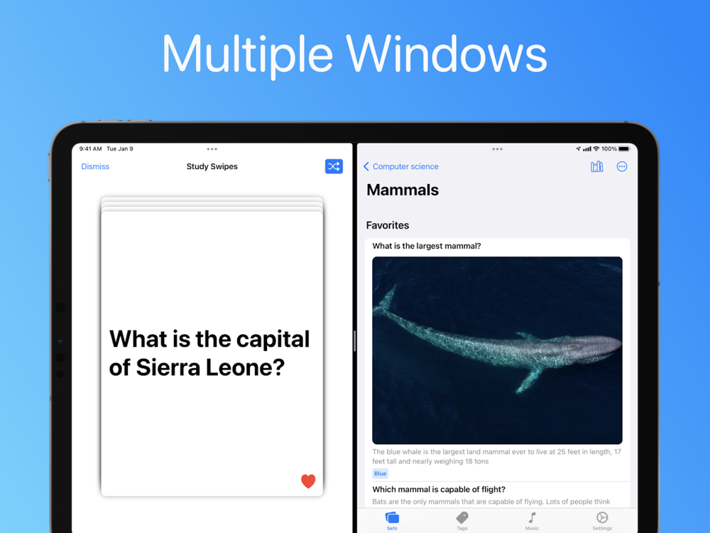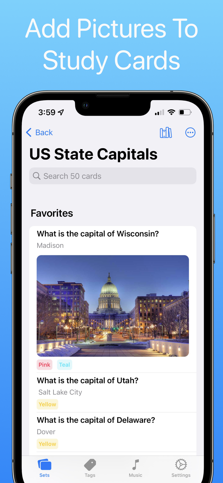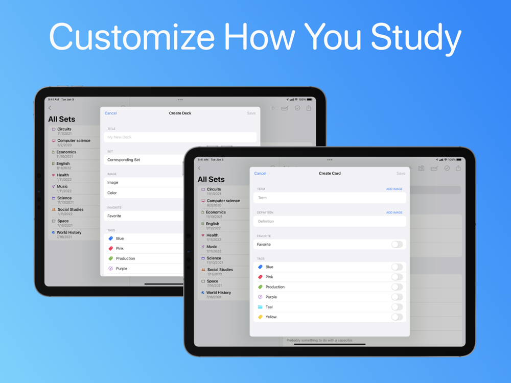 Study Sets is the simplest app for creating and learning study cards. With three different ways to study (matching, flashcards, and multiple choice) and features such as picture support, multi device sync, widgets and tagging, studying has never been easier. With Apple Music integration you can easily listen to your songs while you study. Being subscription based, you won't ever be upsold to purchase new features. All features are free with the only exception being that you're limited to creating 50 cards.