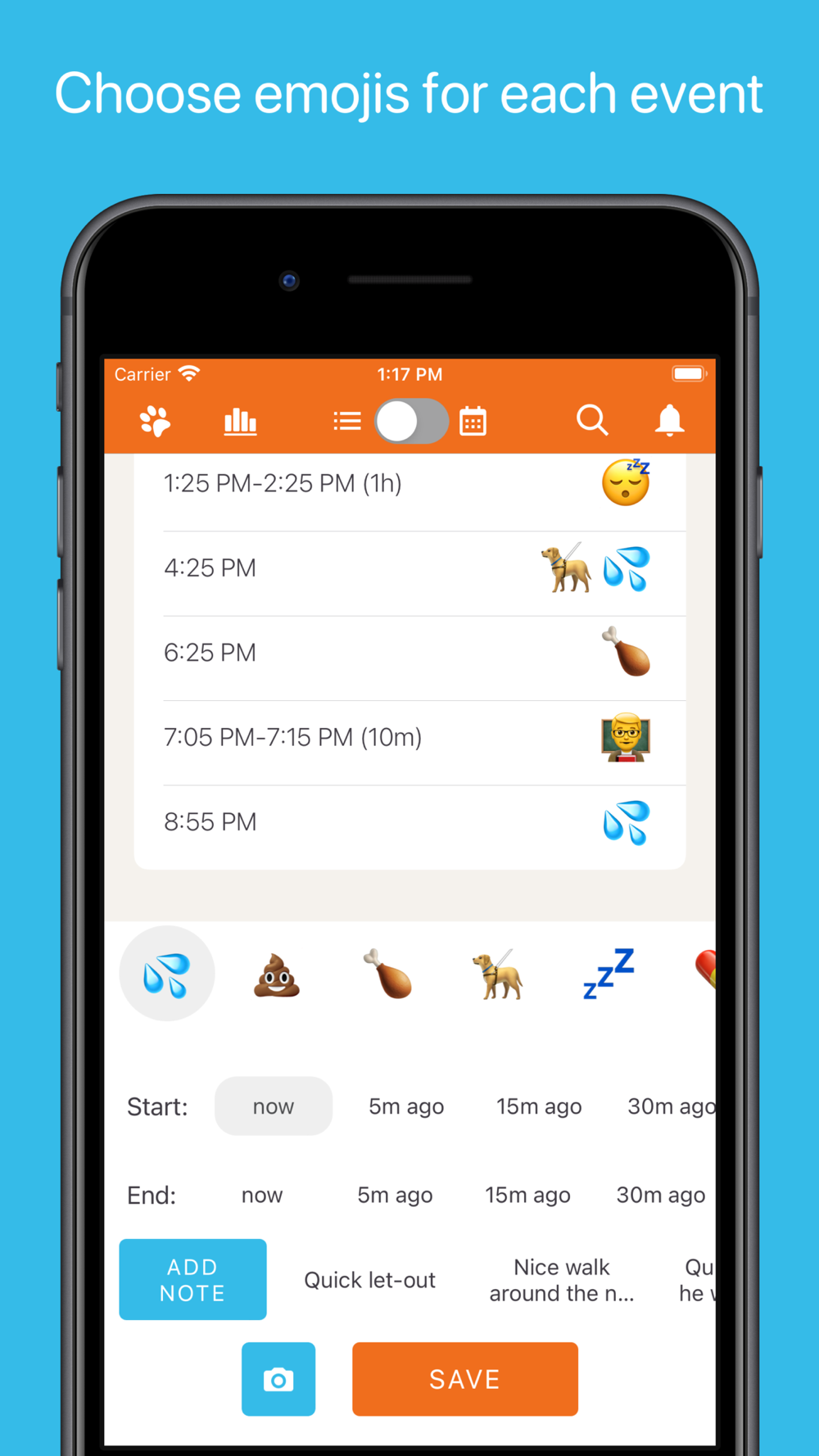Quickly see when was the last time you took your dog out to go to the bathroom, the last time you fed them, the last time you gave them their meds, and whatever else you want to keep track of.