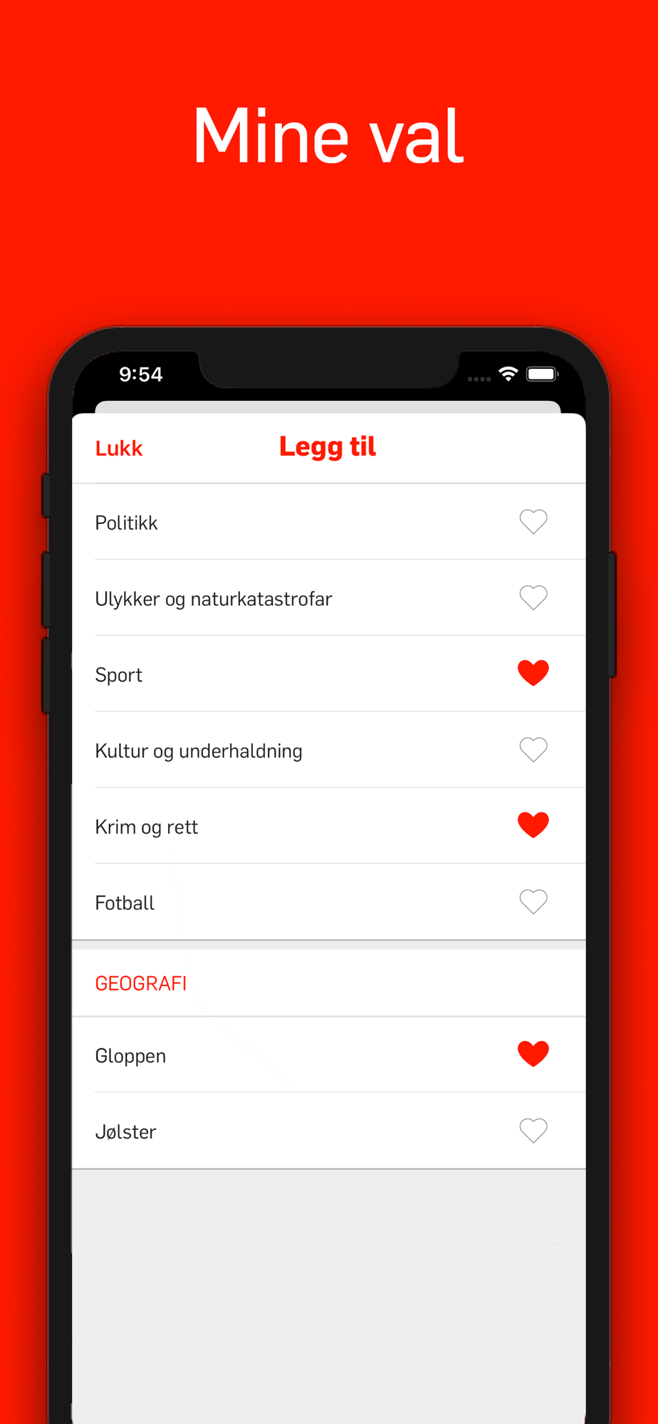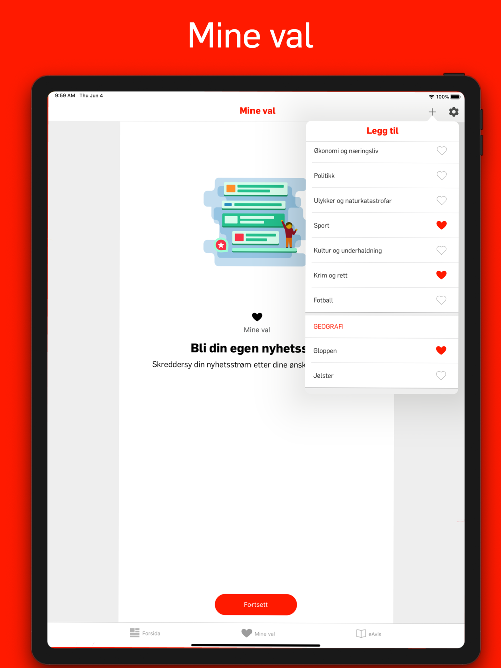 I den nye appen vår kan du vera din eigen nyheitssjef. Vel sjølv kva kategoriar, emne og stader du ønskjer nyheiter frå og vil bli varsla om. Du kan òg følgja din favorittjournalist. Hald deg oppdatert om det du sjølv synest er viktig i våre artiklar, bilete og videoar.