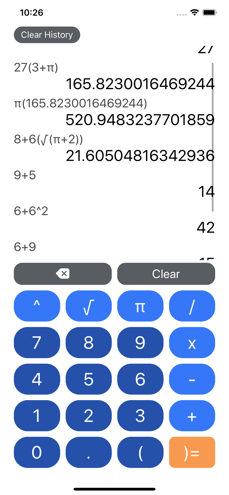 Enter complicated math expressions with the calculator. This calculator keeps history of all the math expressions and answers to allow you to easily recall previous calculations.