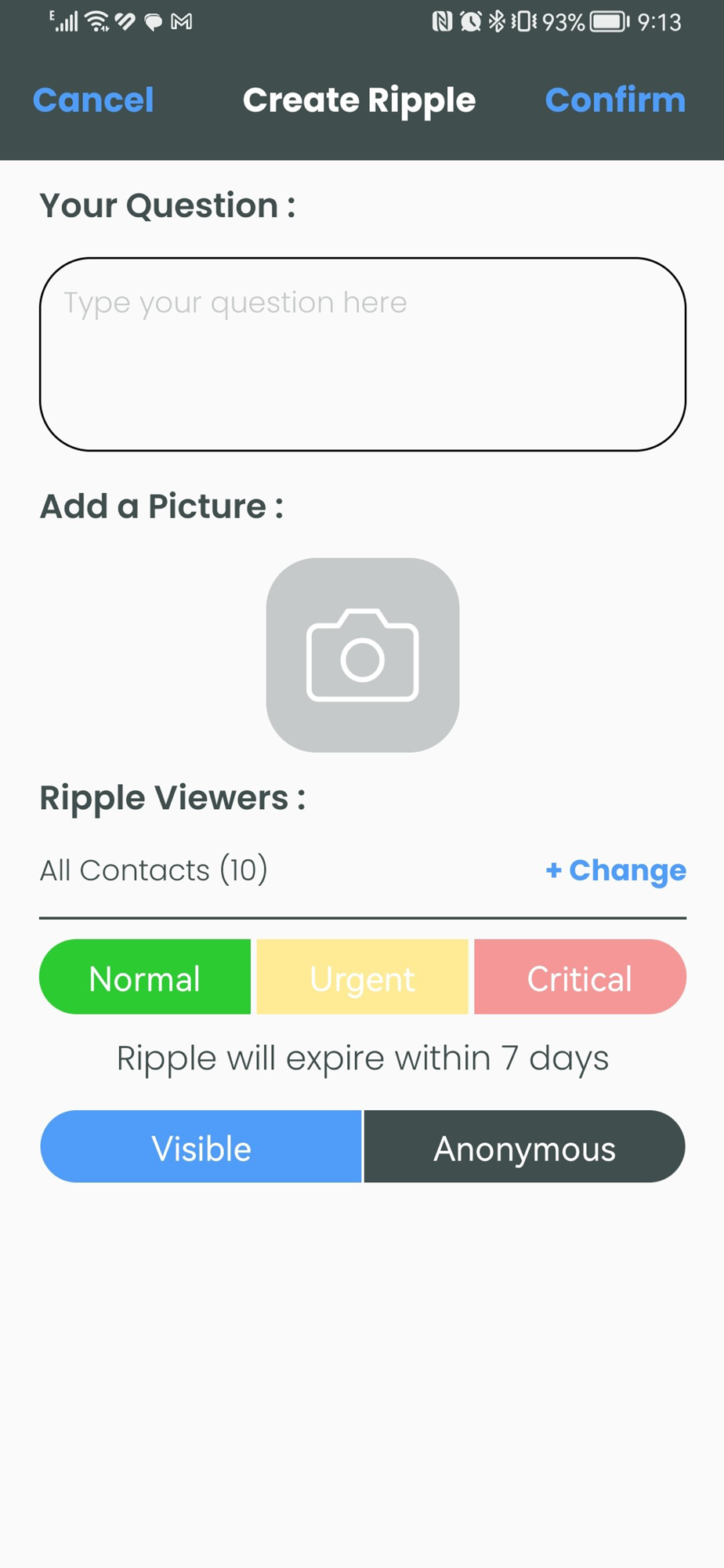 You can create a question by tapping the blue circular icon. Ask your contacts questions openly or anonymously. Set time expiry to your questions depending on urgency.